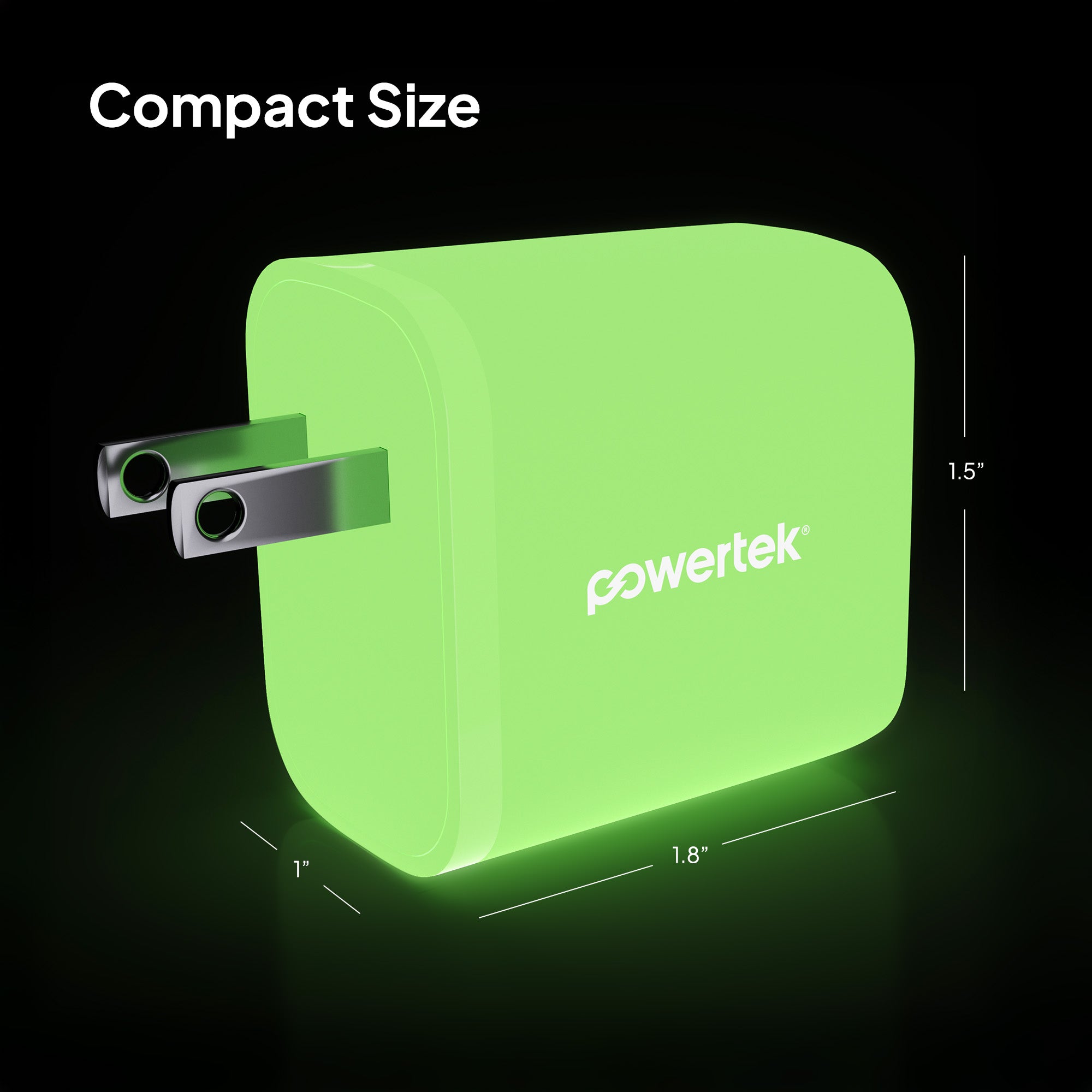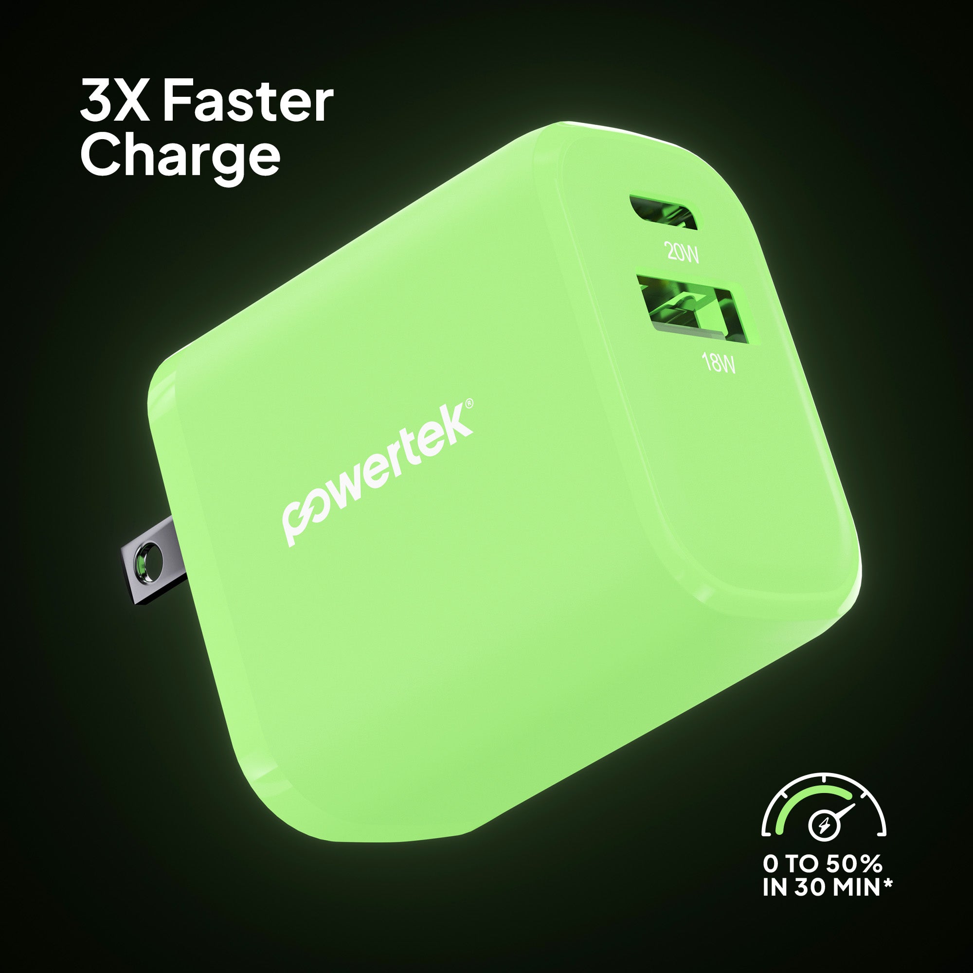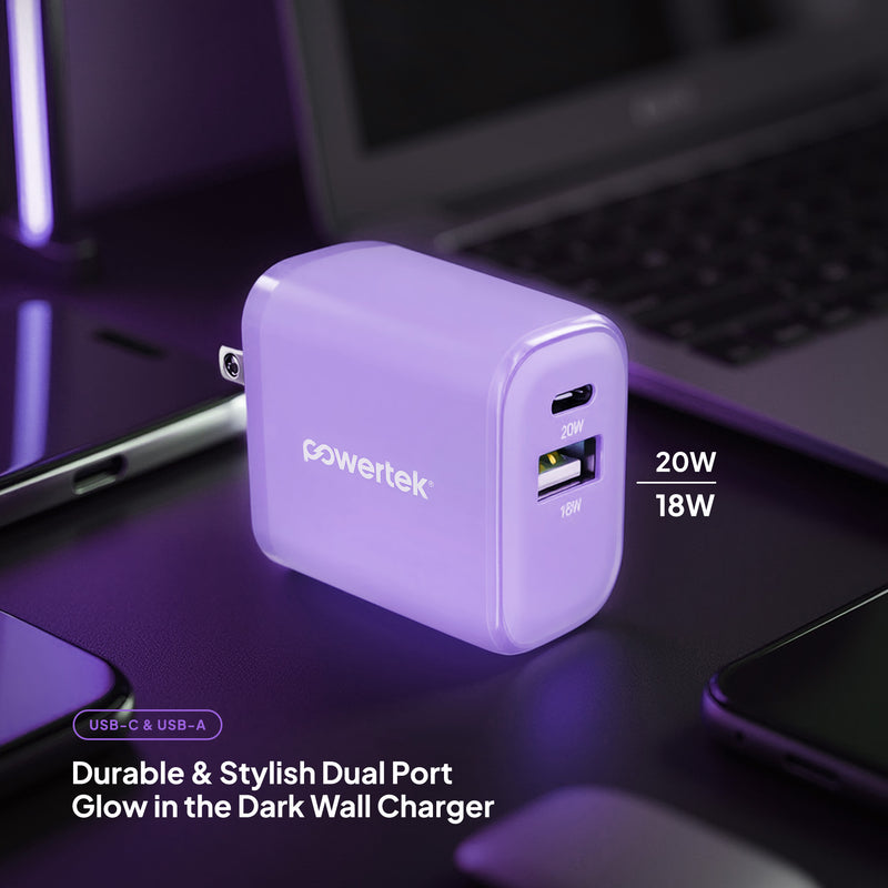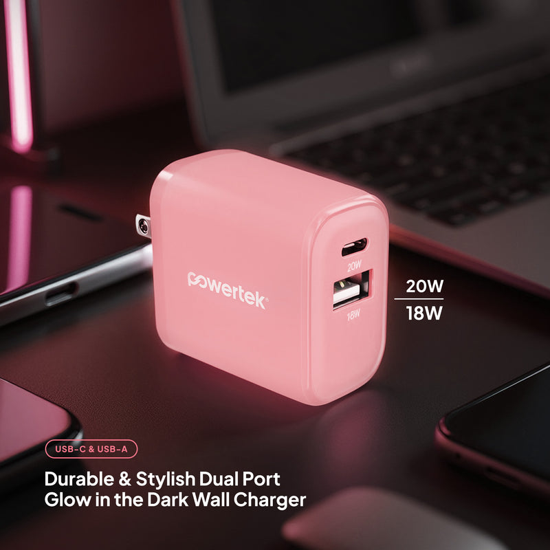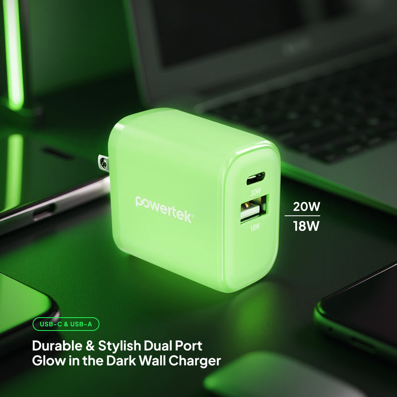 Powertek Glow in the Dark 20W Dual-Port Wall Charger (USB-A & USB-C)
