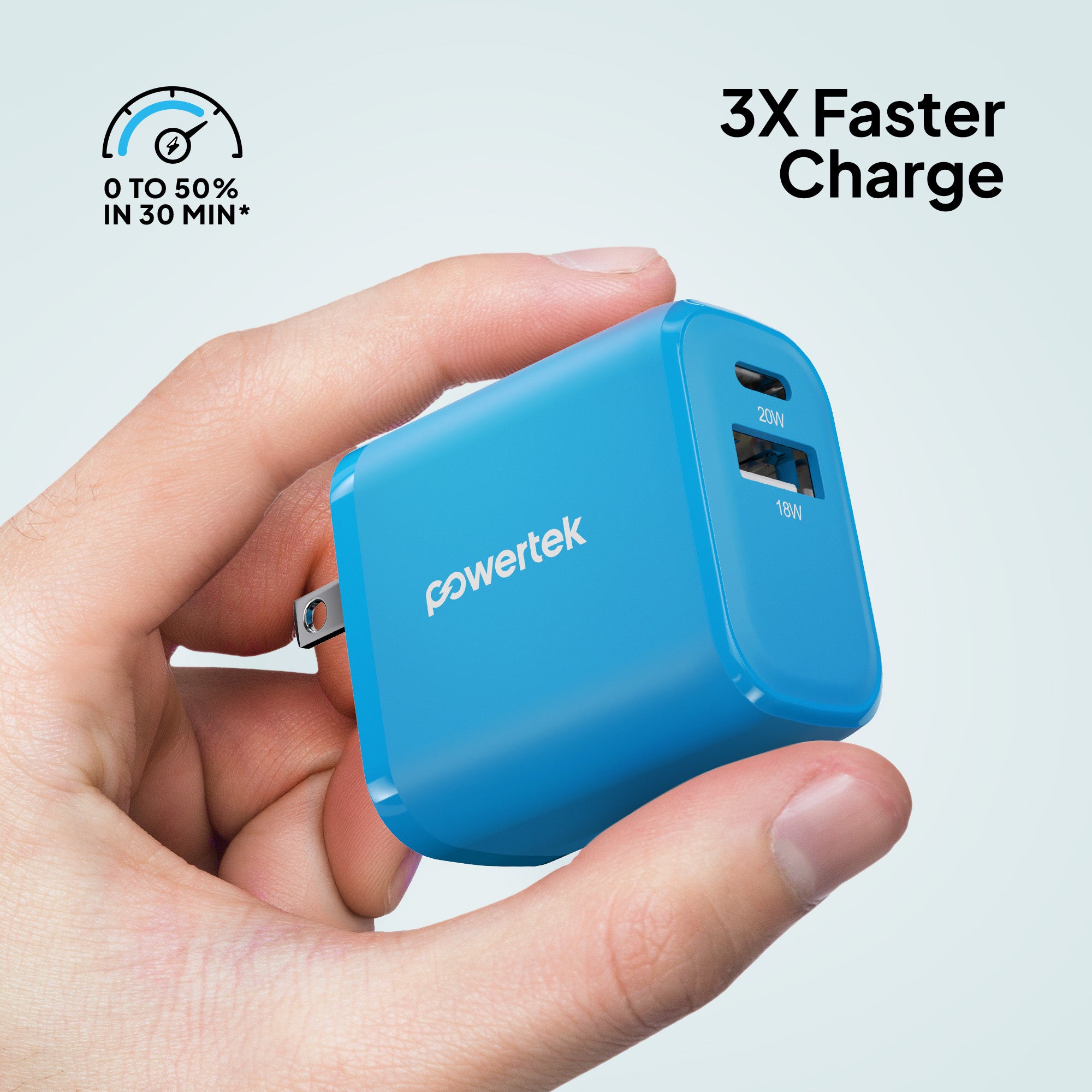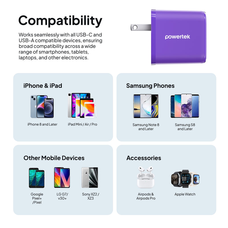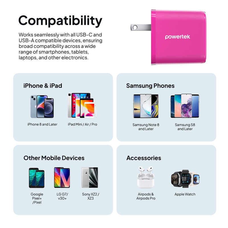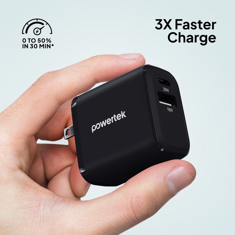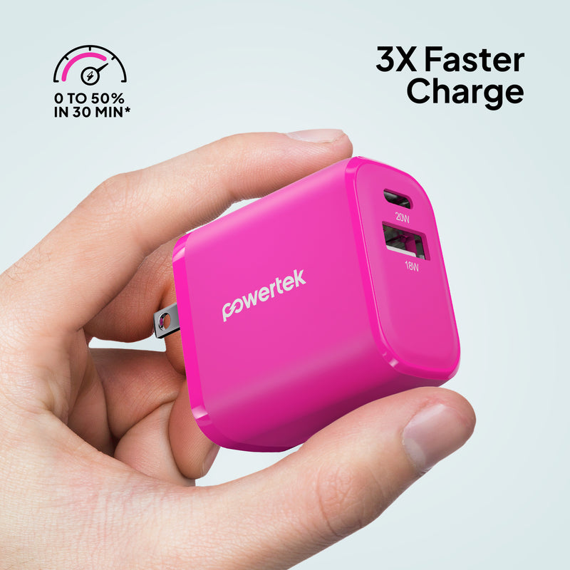 Charge smarter and faster with the Powertek Neon Wall Block Charger. Featuring a 20W USB-C PD (Power Delivery) port and an additional 18W USB-A port, this compact charger powers your iPhone, Galaxy, Pixel, or other devices up to 50% in just 30 minutes. Lightweight and portable, it’s perfect for home, office, or travel. Universally compatible with smartphones, tablets, and more.