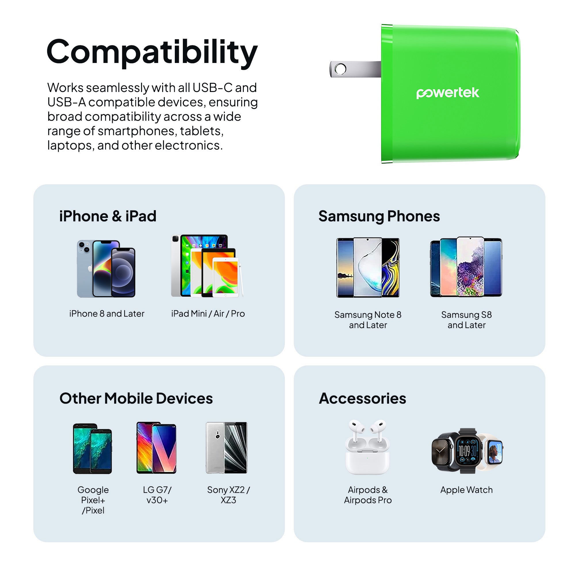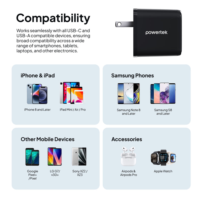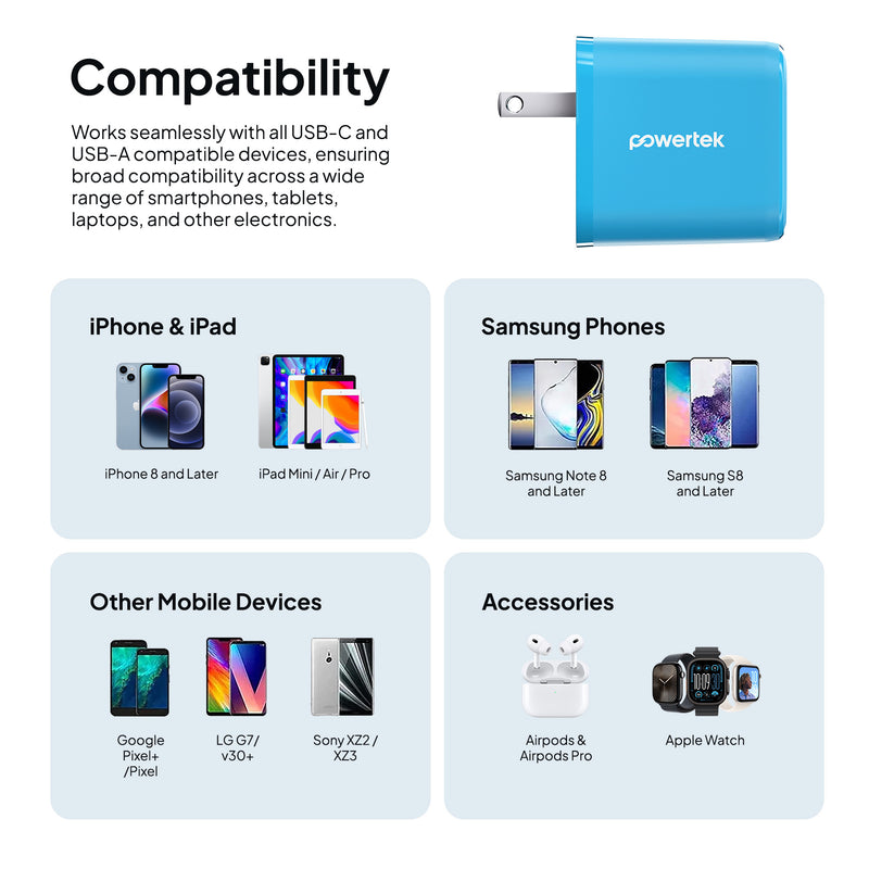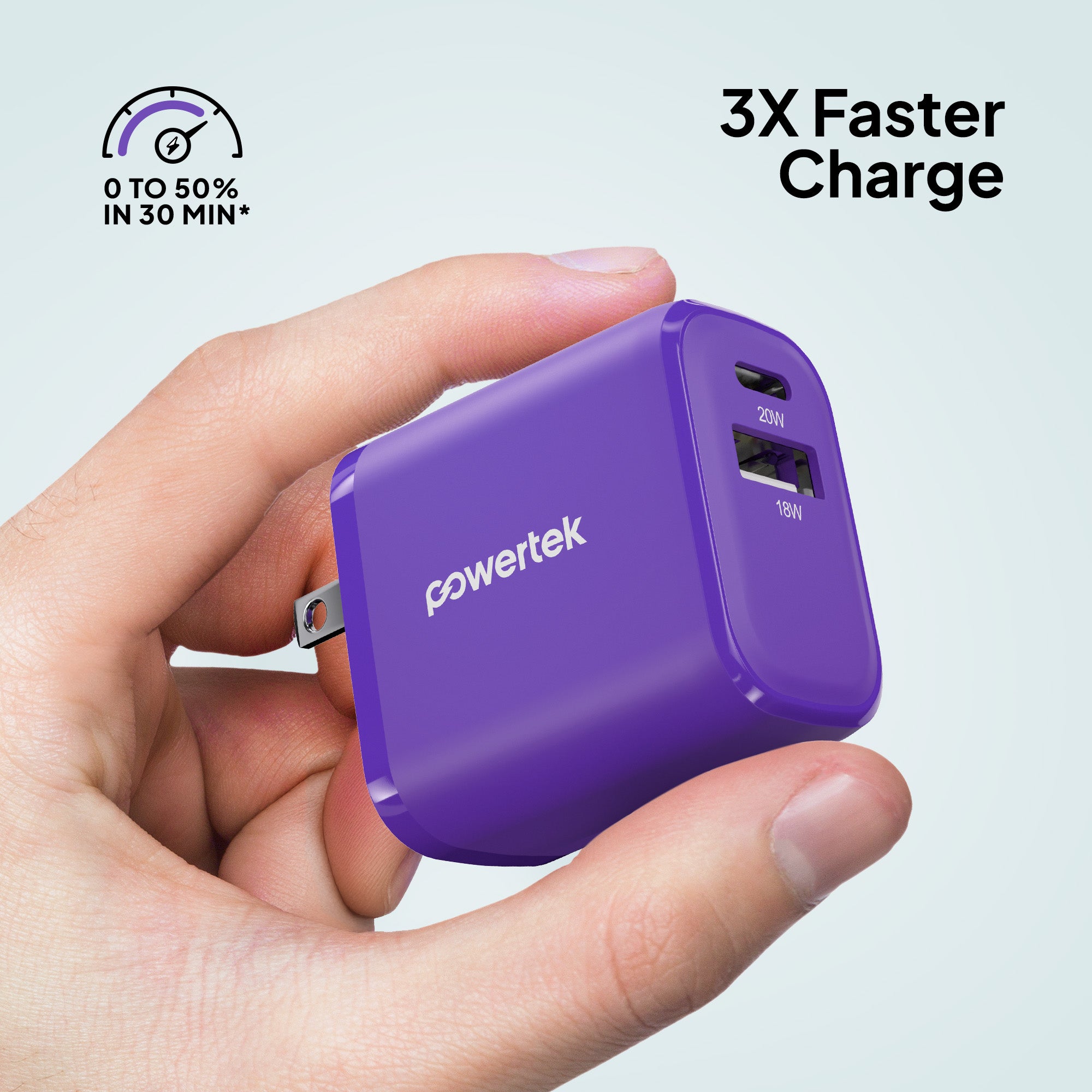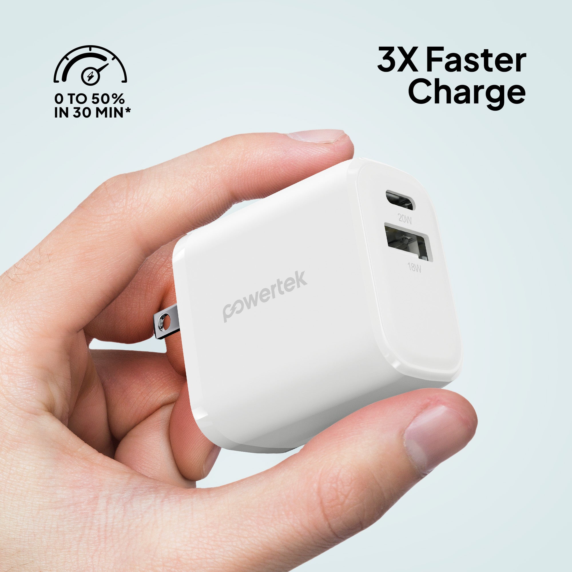 Charge smarter and faster with the Powertek Neon Wall Block Charger. Featuring a 20W USB-C PD (Power Delivery) port and an additional 18W USB-A port, this compact charger powers your iPhone, Galaxy, Pixel, or other devices up to 50% in just 30 minutes. Lightweight and portable, it’s perfect for home, office, or travel. Universally compatible with smartphones, tablets, and more.