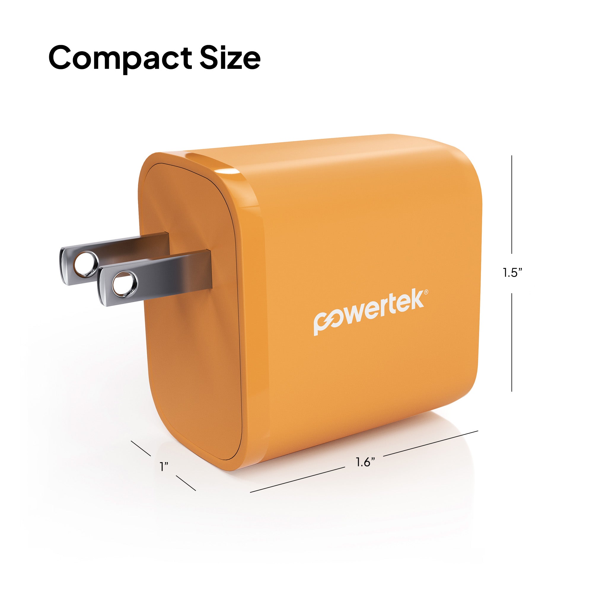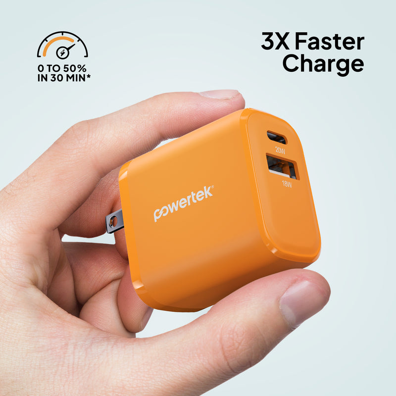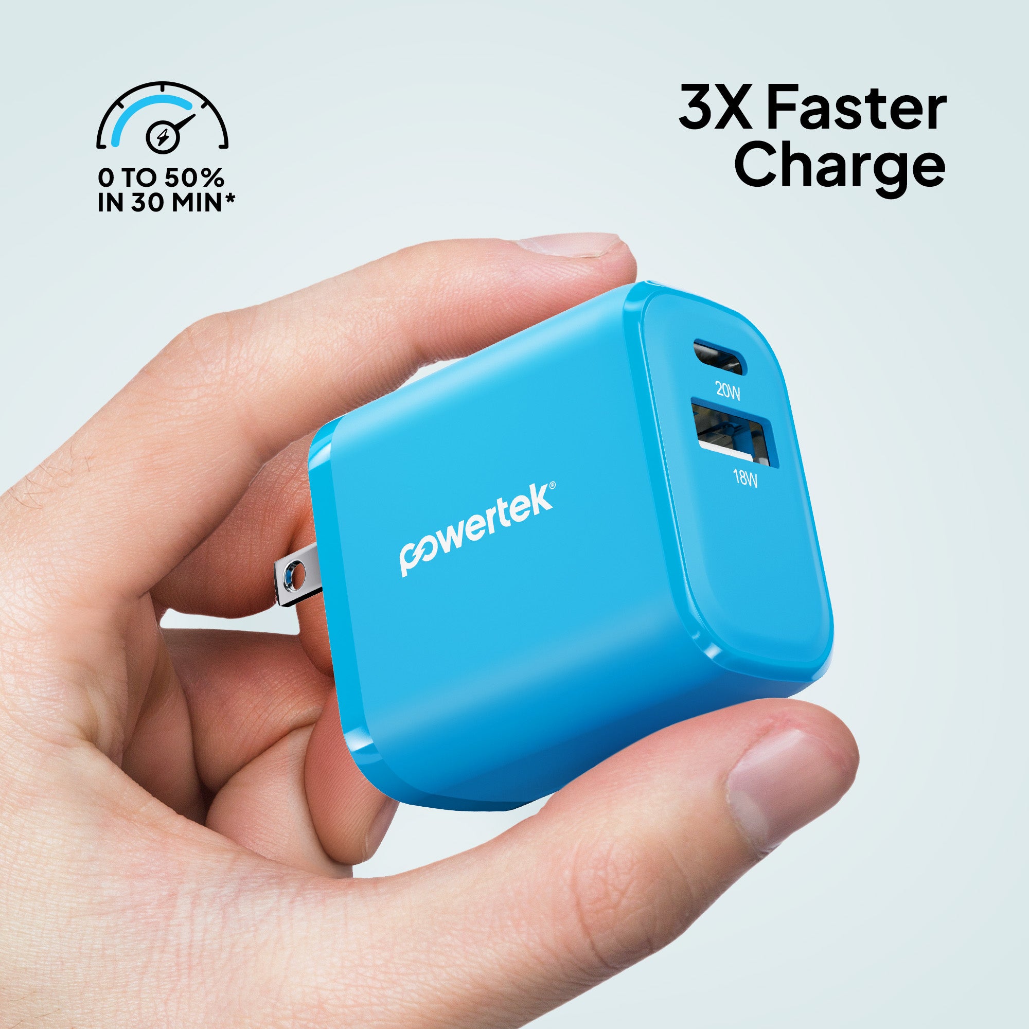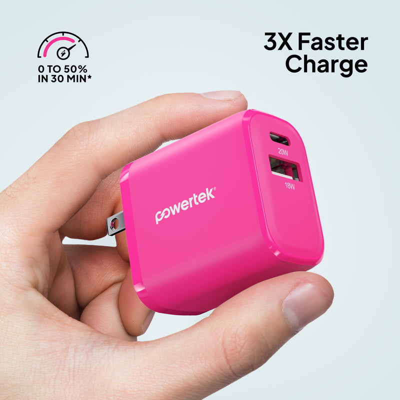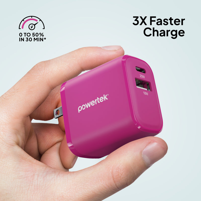 Charge smarter and faster with the Powertek Neon Two-Tone Wall Block Charger. Featuring a 20W USB-C PD (Power Delivery) port and an additional 18W USB-A port, this compact charger powers your iPhone, Galaxy, Pixel, or other devices up to 50% in just 30 minutes. Lightweight and portable, it’s perfect for home, office, or travel. Universally compatible with smartphones, tablets, and more.