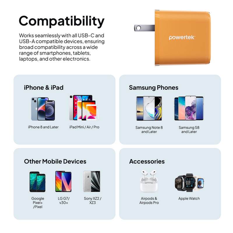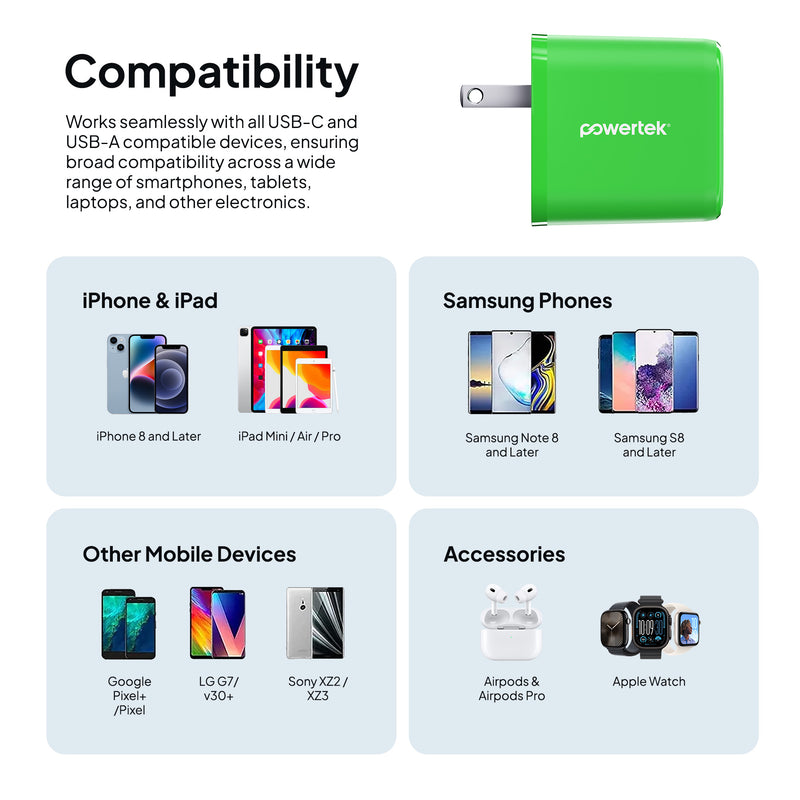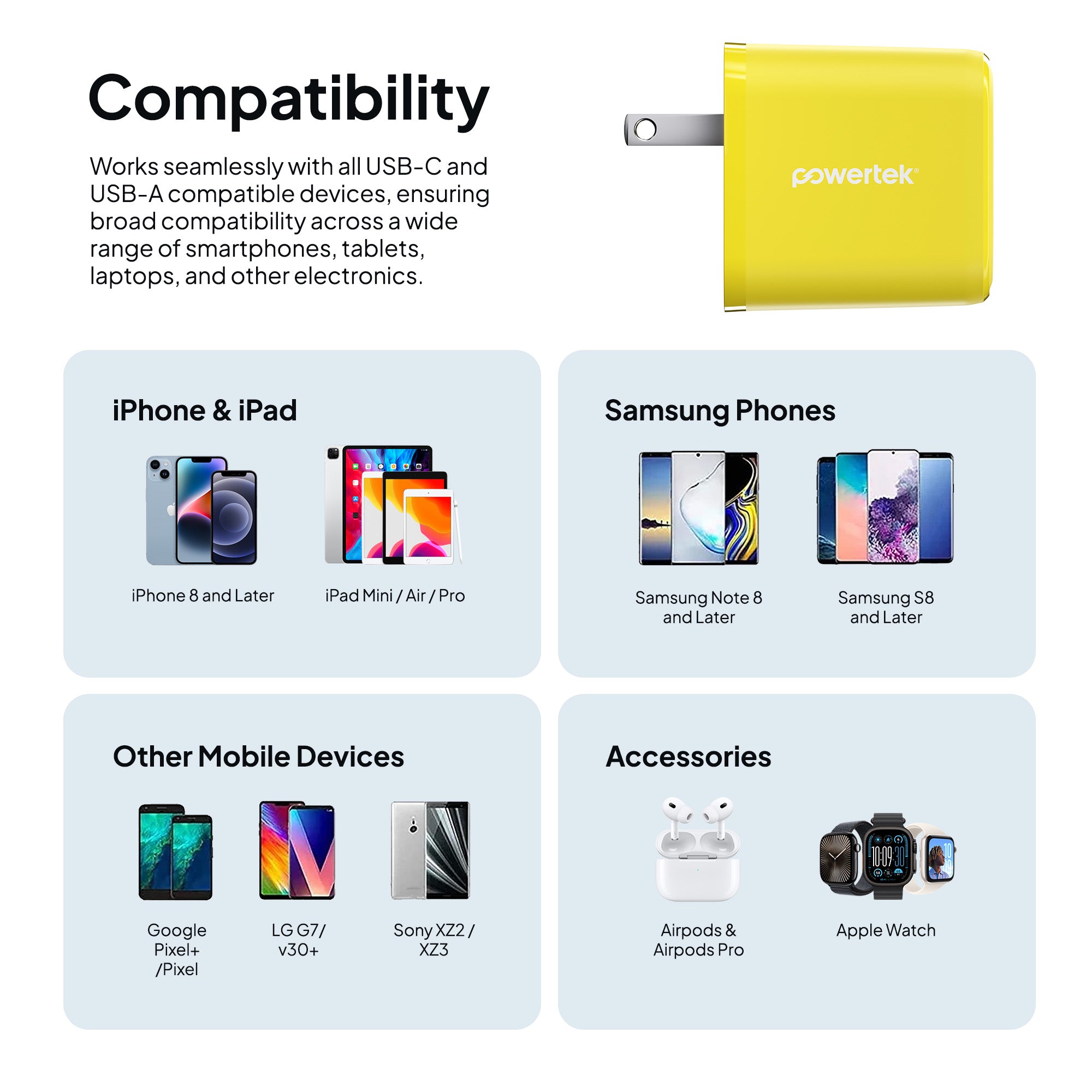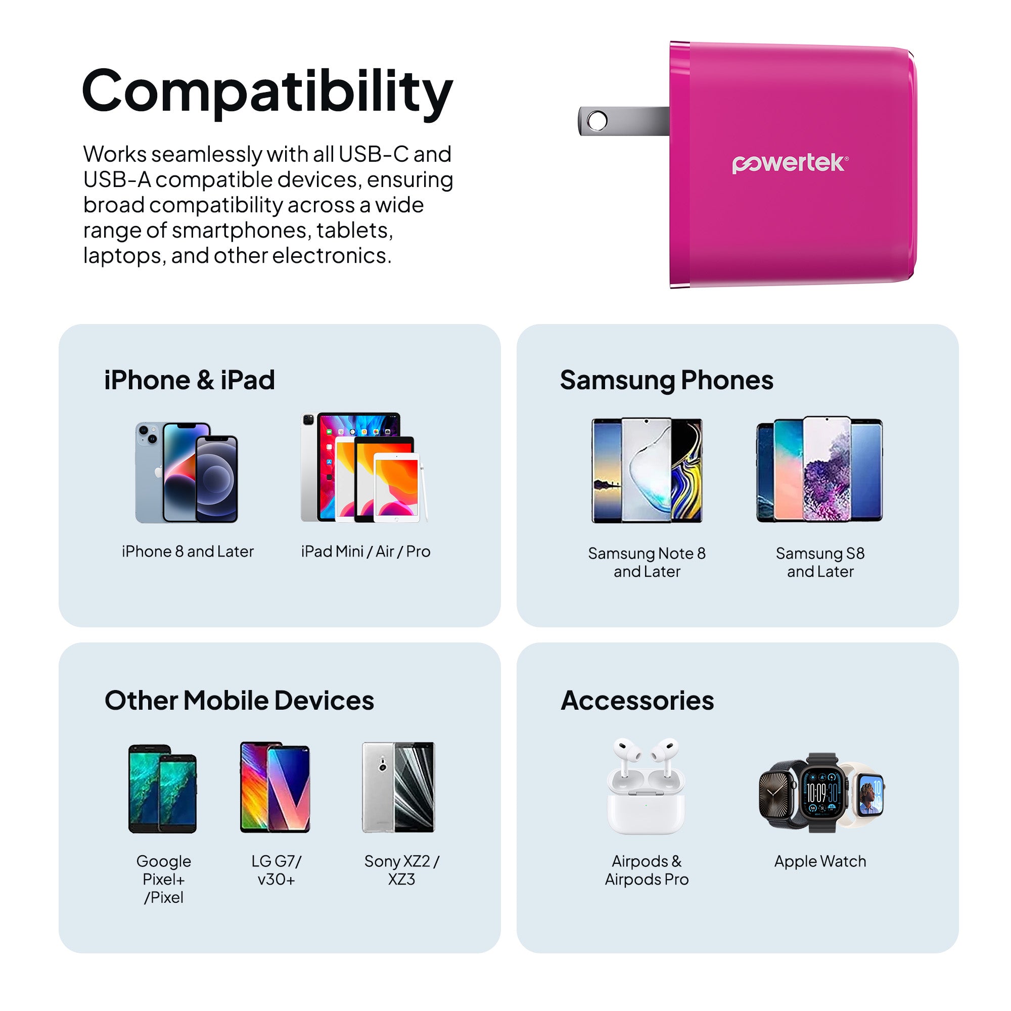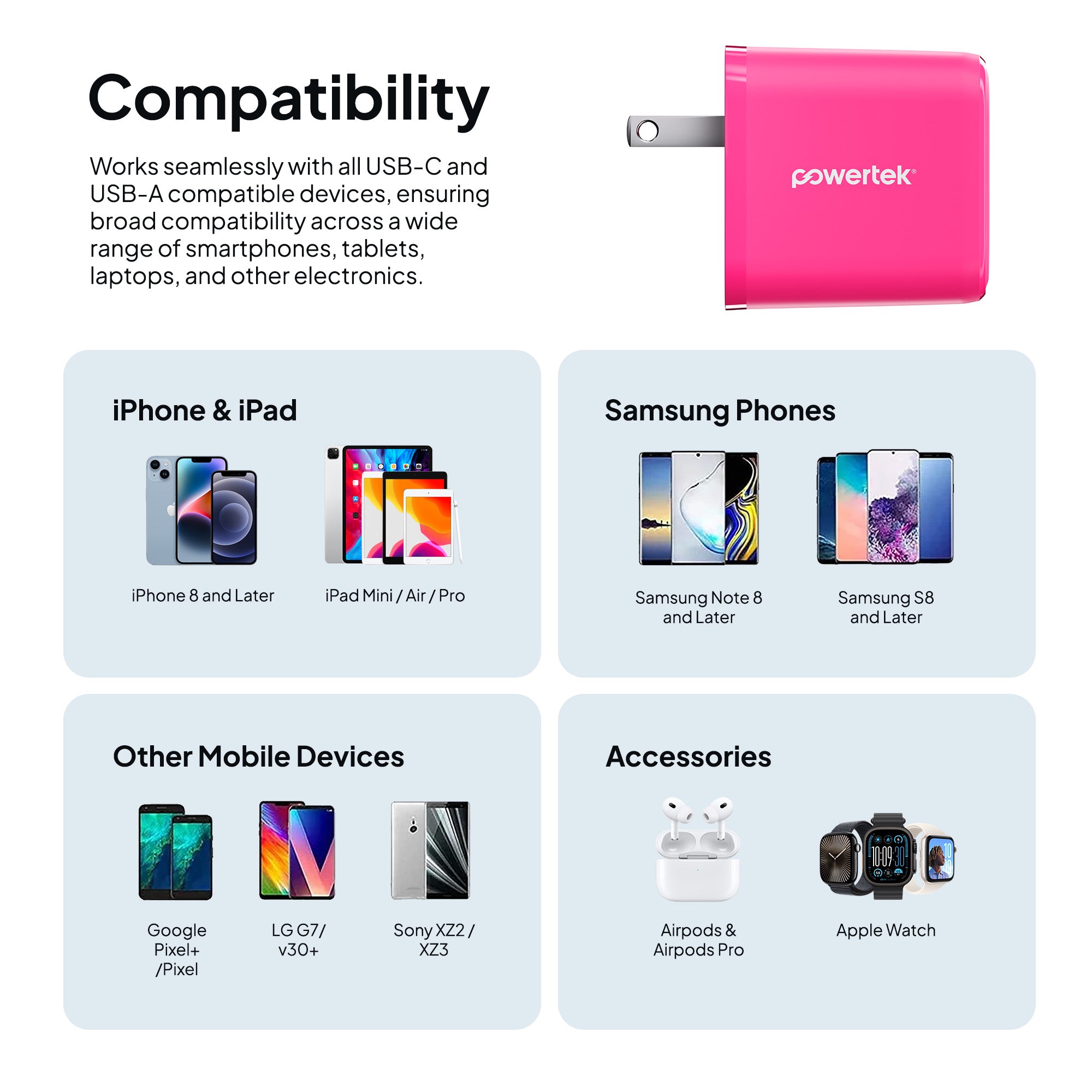 Charge smarter and faster with the Powertek Neon Two-Tone Wall Block Charger. Featuring a 20W USB-C PD (Power Delivery) port and an additional 18W USB-A port, this compact charger powers your iPhone, Galaxy, Pixel, or other devices up to 50% in just 30 minutes. Lightweight and portable, it’s perfect for home, office, or travel. Universally compatible with smartphones, tablets, and more.