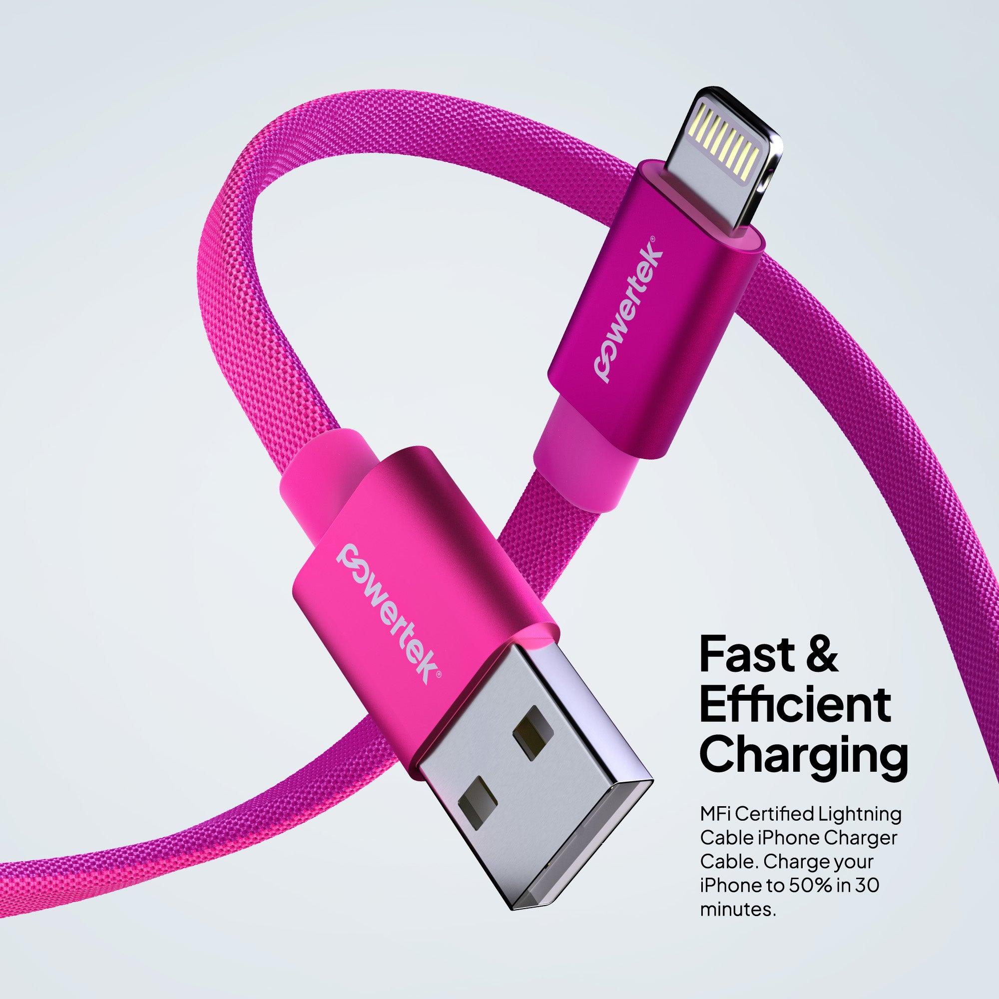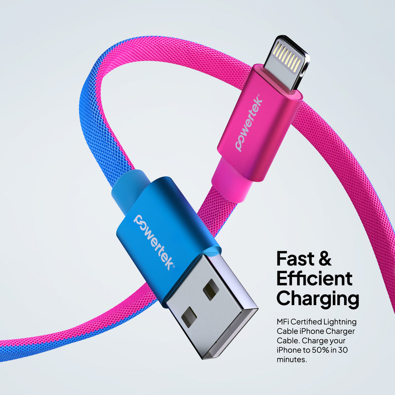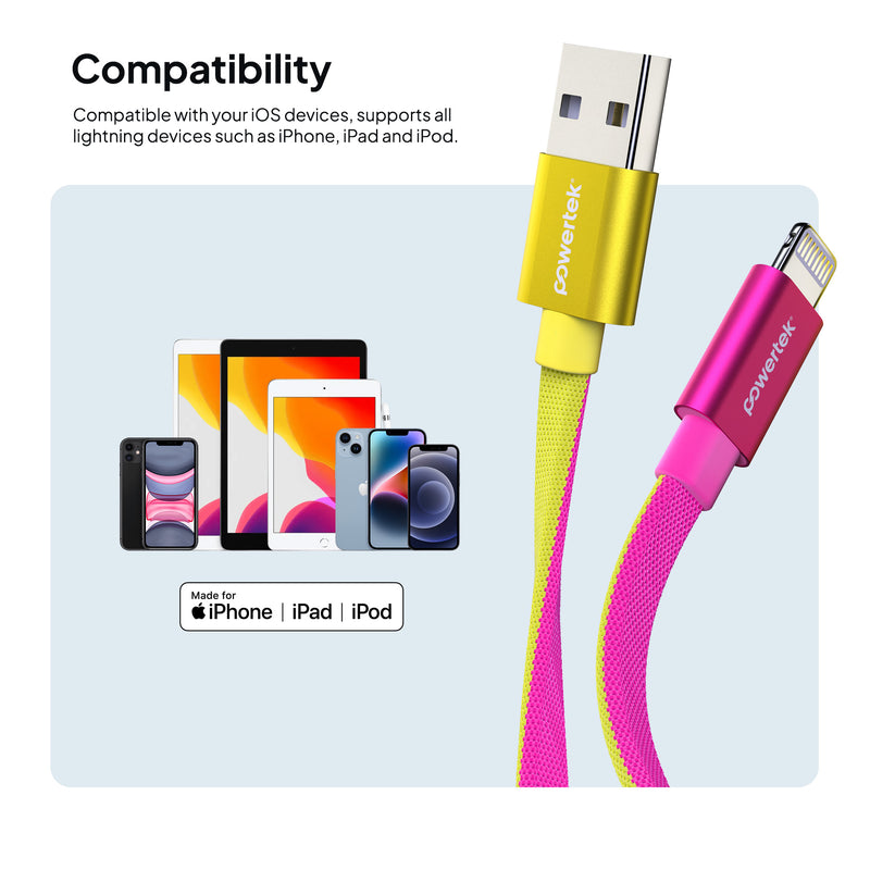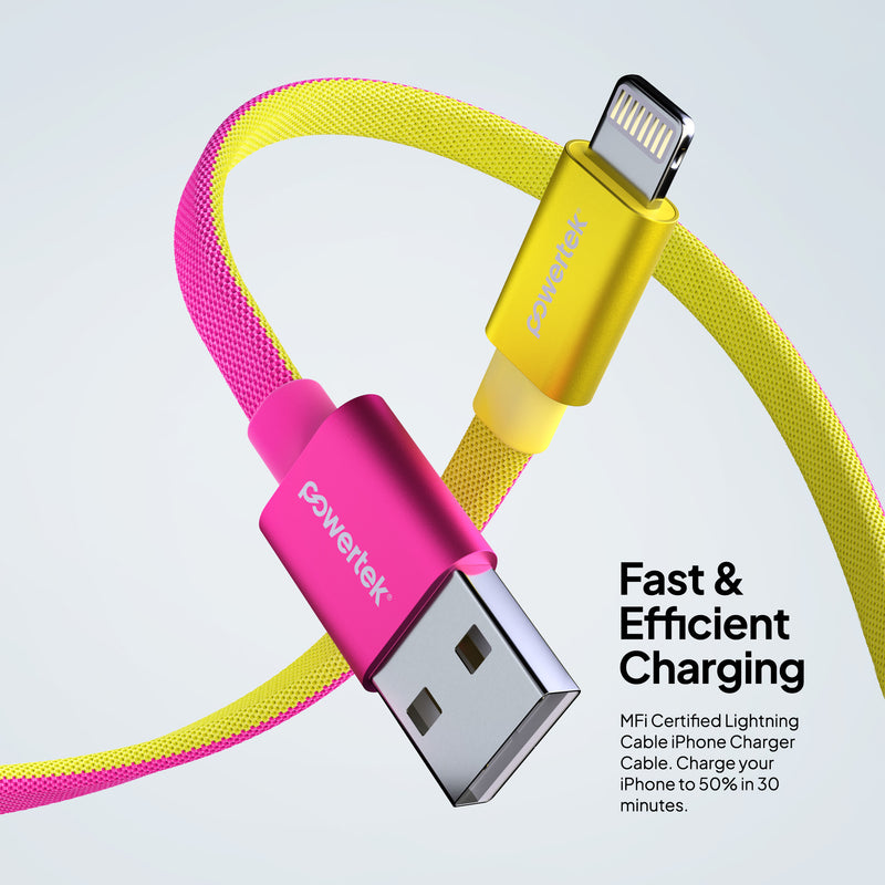 Upgrade your charging setup with the Powertek Neon Two-Tone Lightning cable, designed for iPhone, iPad, and iPod. Built with MFi-certified chips for safe, reliable charging and a durable braided nylon design for long-lasting performance. Available in six stylish colors, so you can match your phone case and personal style.
