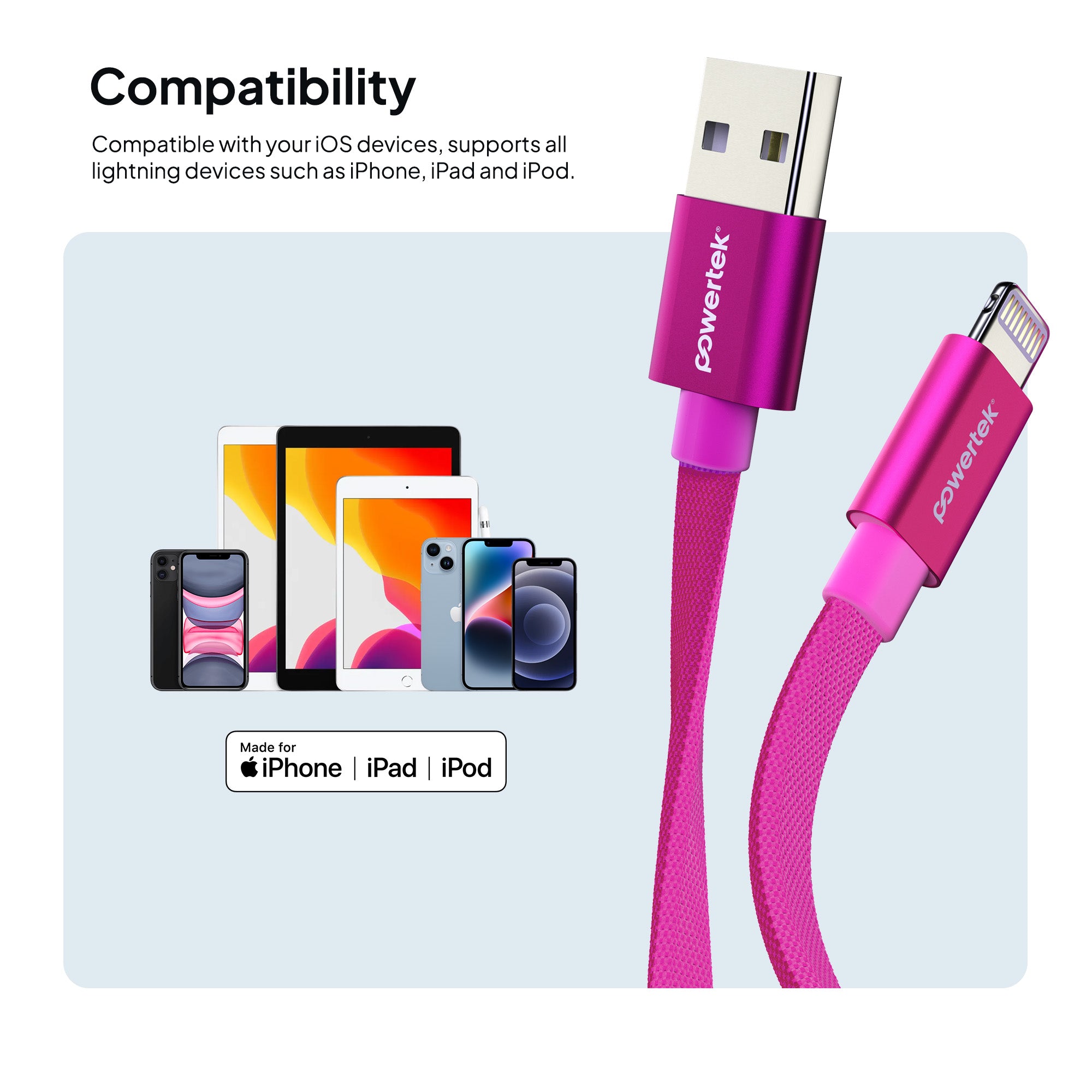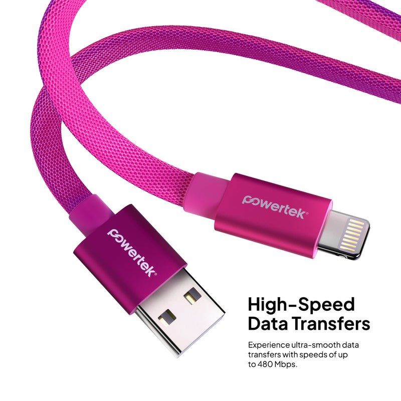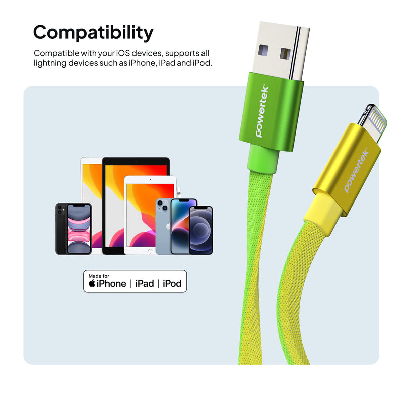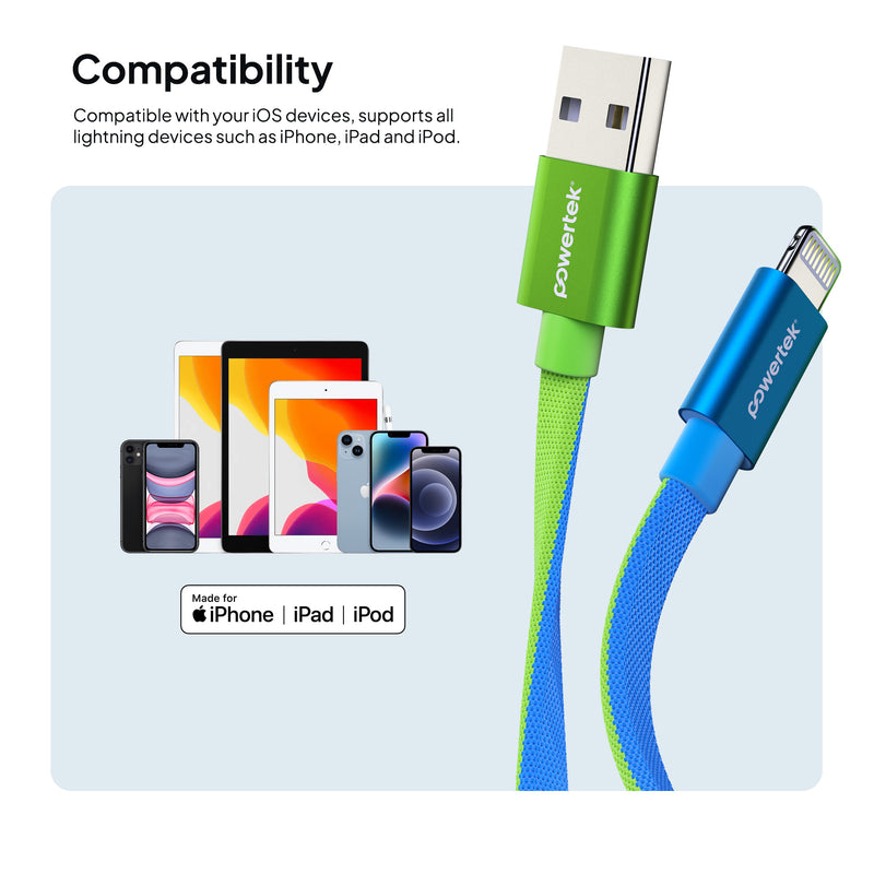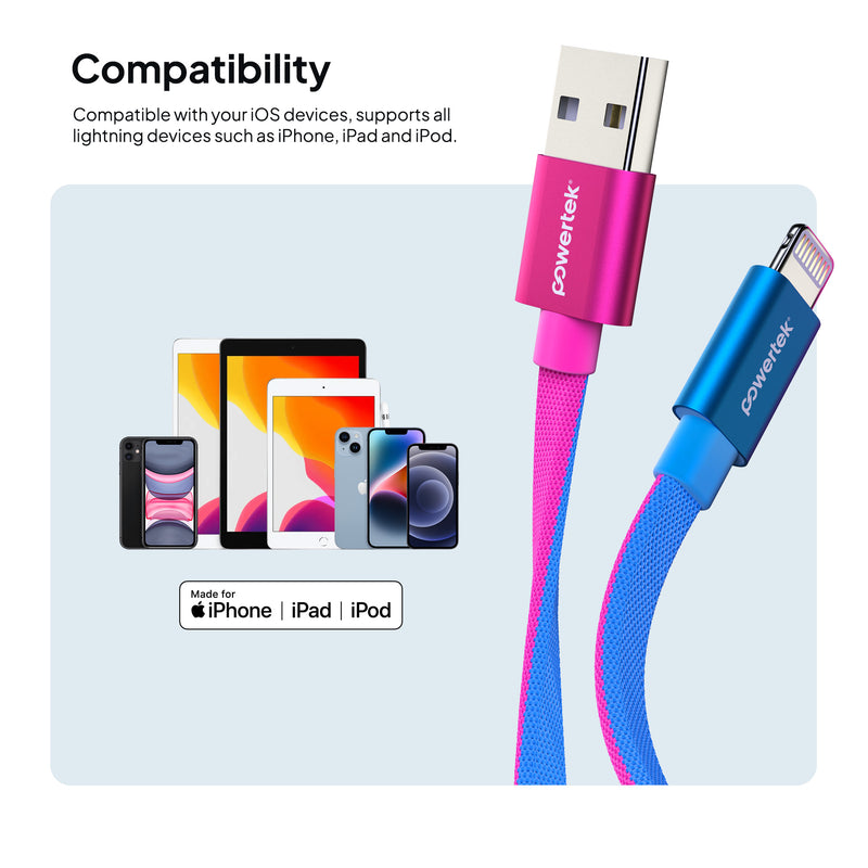 Upgrade your charging setup with the Powertek Neon Two-Tone Lightning cable, designed for iPhone, iPad, and iPod. Built with MFi-certified chips for safe, reliable charging and a durable braided nylon design for long-lasting performance. Available in six stylish colors, so you can match your phone case and personal style.