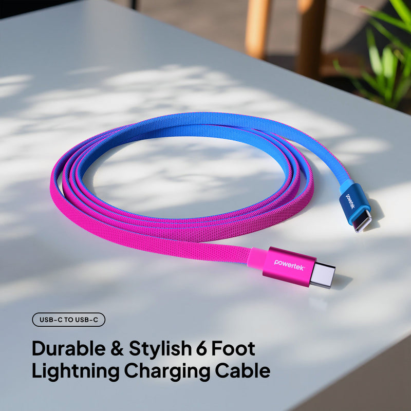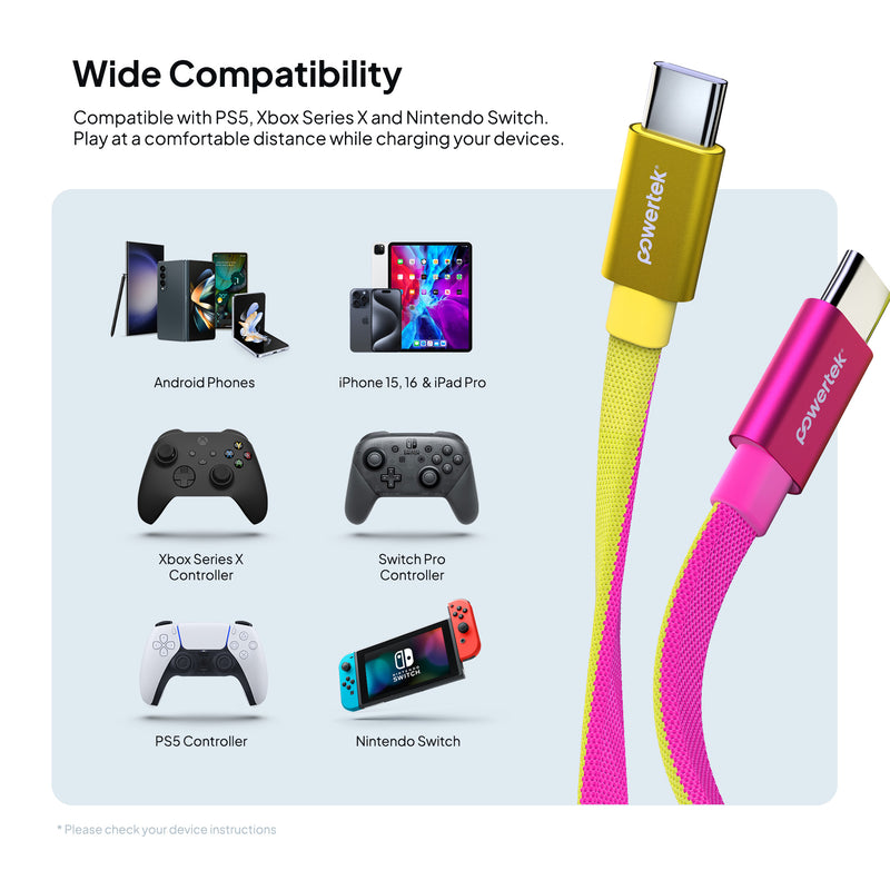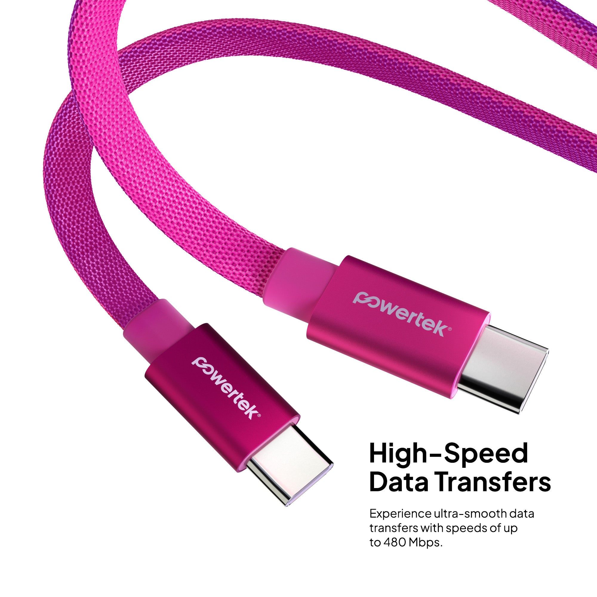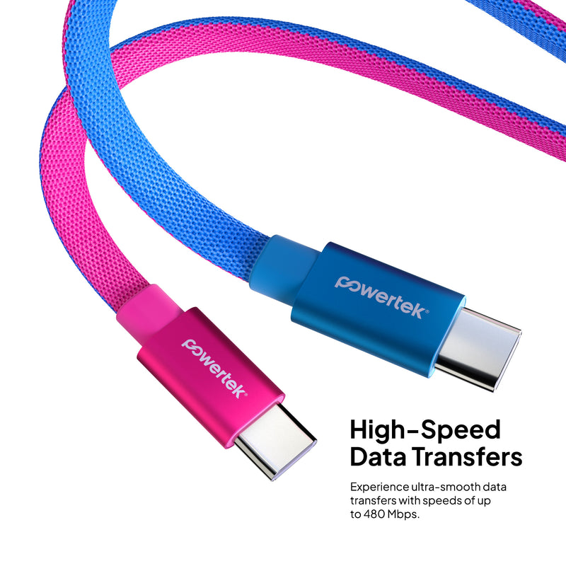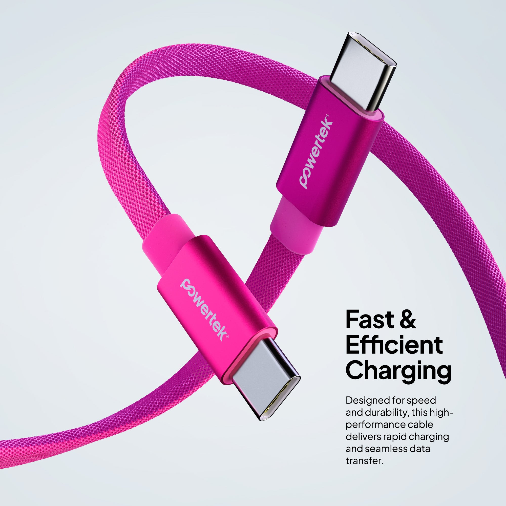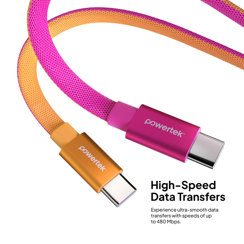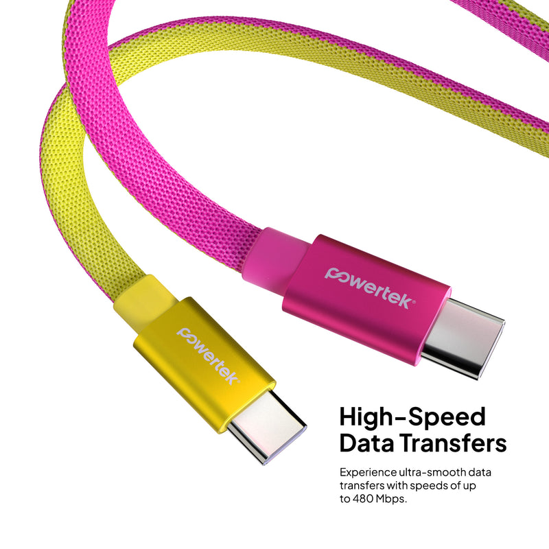 Upgrade your everyday charging experience with the Powertek Neon Two-Tone USB-C to USB-C cable. Built for long-lasting performance, this premium 6-foot cable features a durable braided nylon design and high-quality USB-C chips for reliable, fast charging every time. Available in six stylish colors, so you can pick the perfect match for your phone case or personal style.