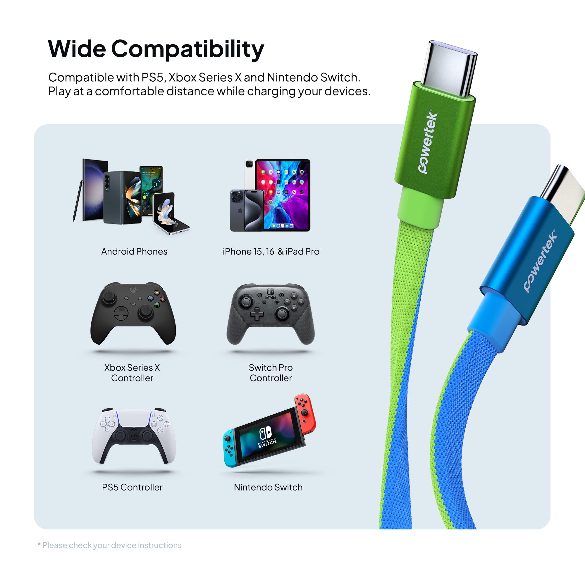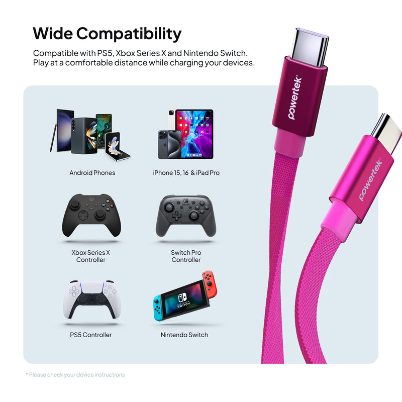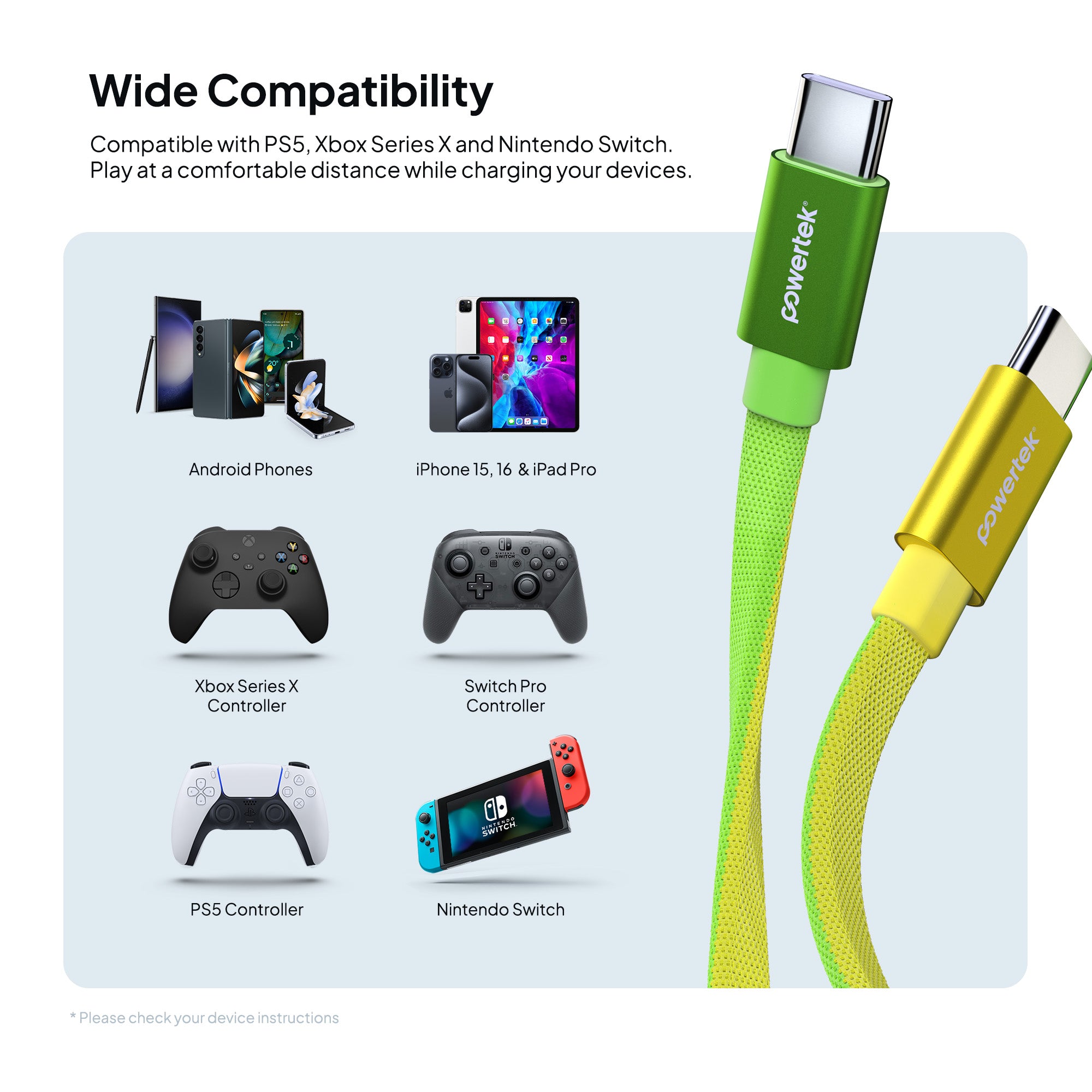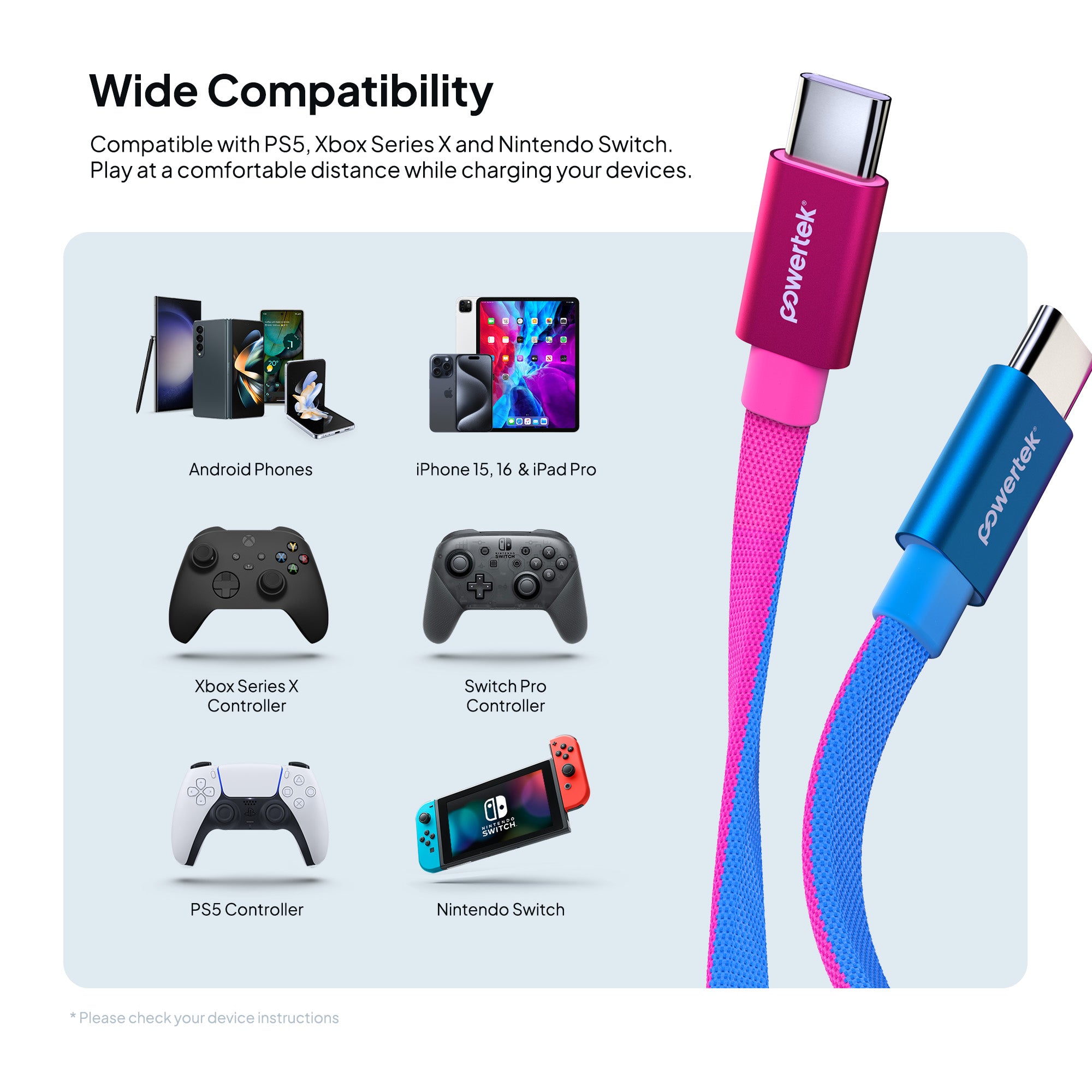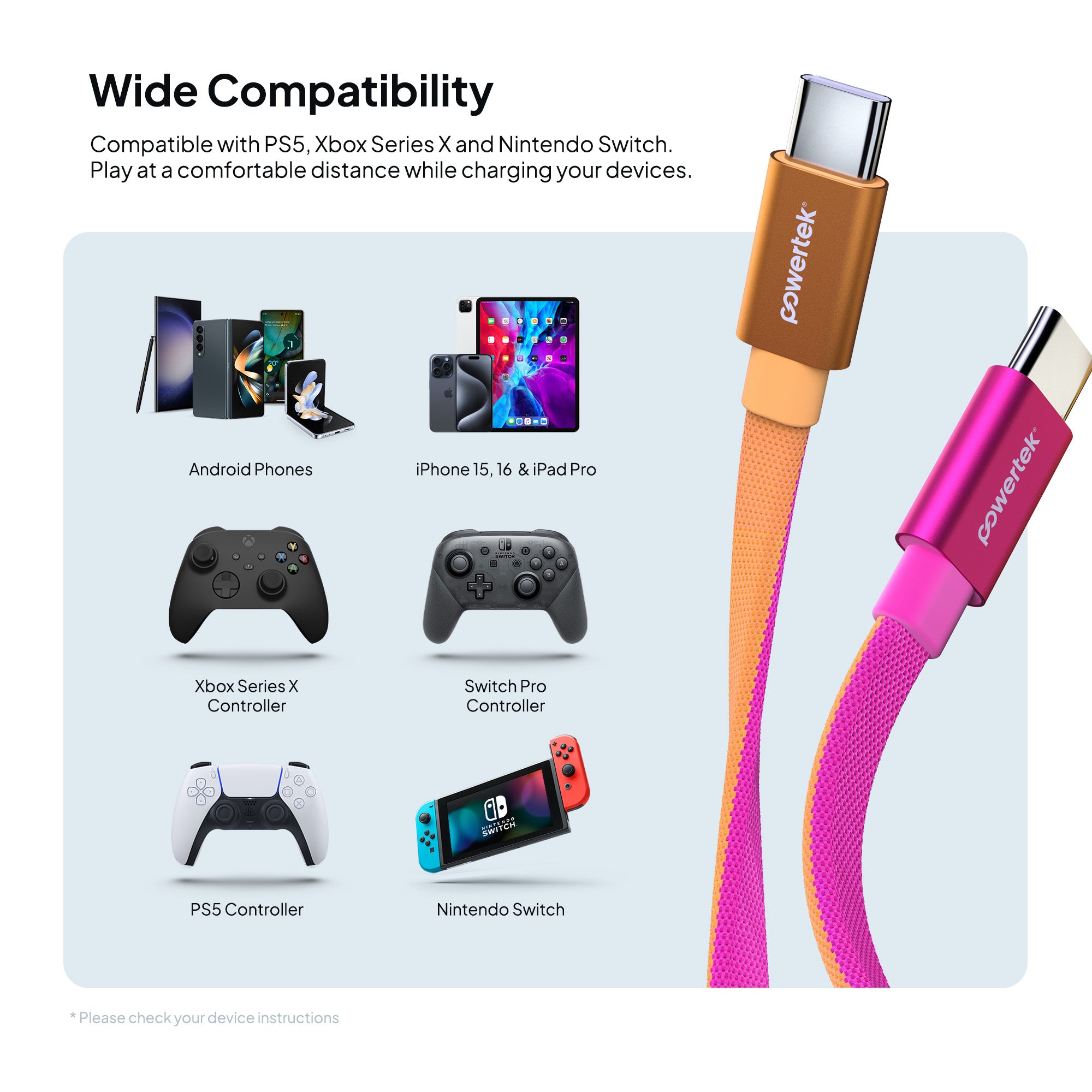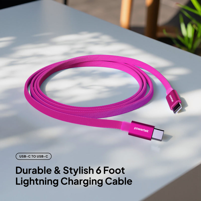 Upgrade your everyday charging experience with the Powertek Neon Two-Tone USB-C to USB-C cable. Built for long-lasting performance, this premium 6-foot cable features a durable braided nylon design and high-quality USB-C chips for reliable, fast charging every time. Available in six stylish colors, so you can pick the perfect match for your phone case or personal style.