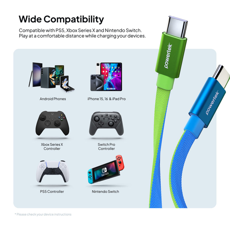 Compatible with smartphones, tablets, and laptops, this cable pairs seamlessly with the Powertek portable battery banks or wall block chargers for the ultimate charging setup.