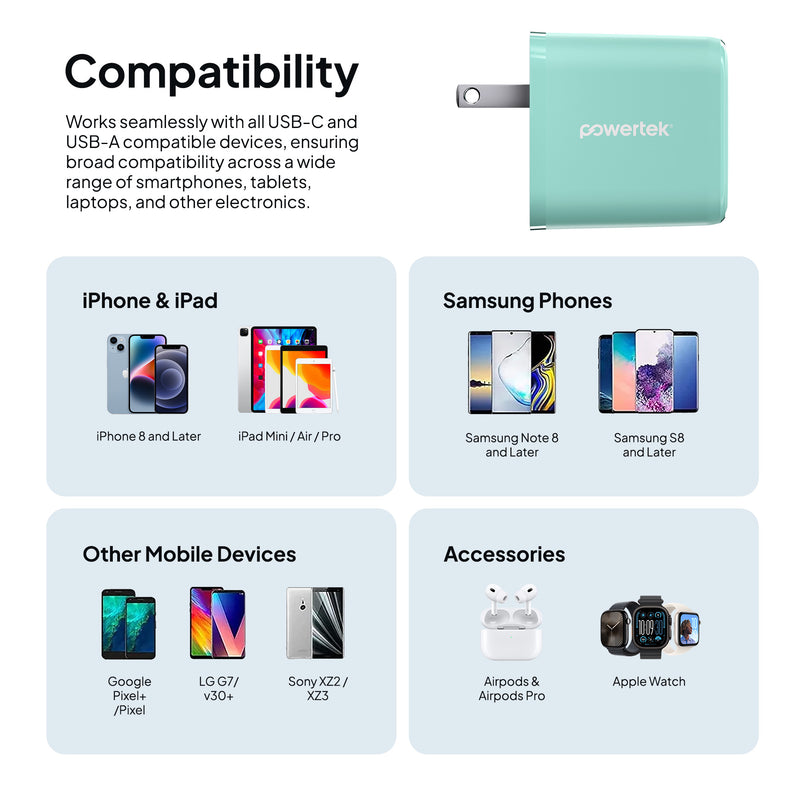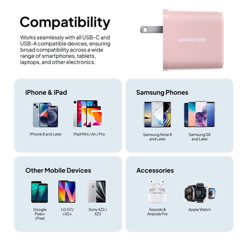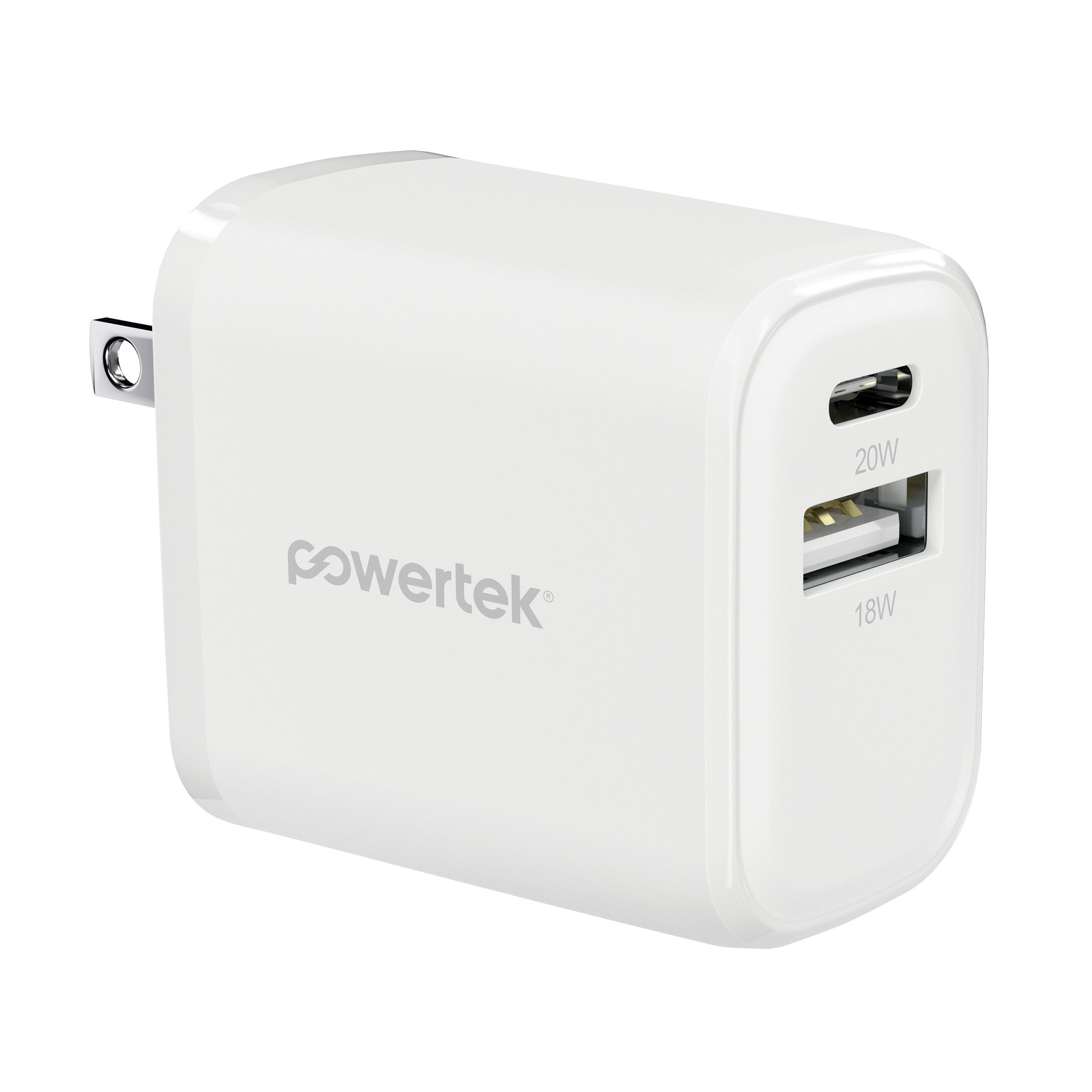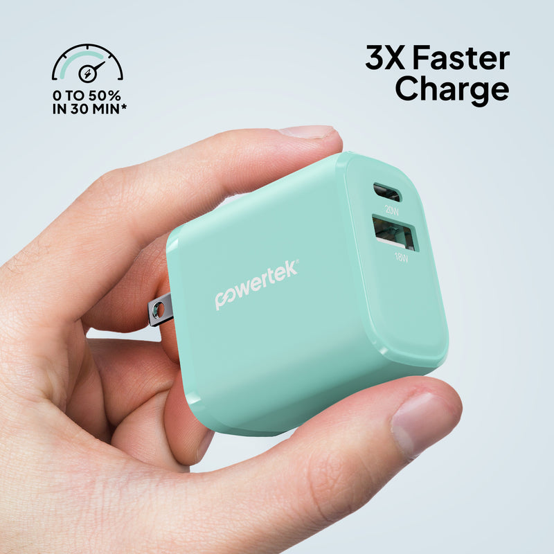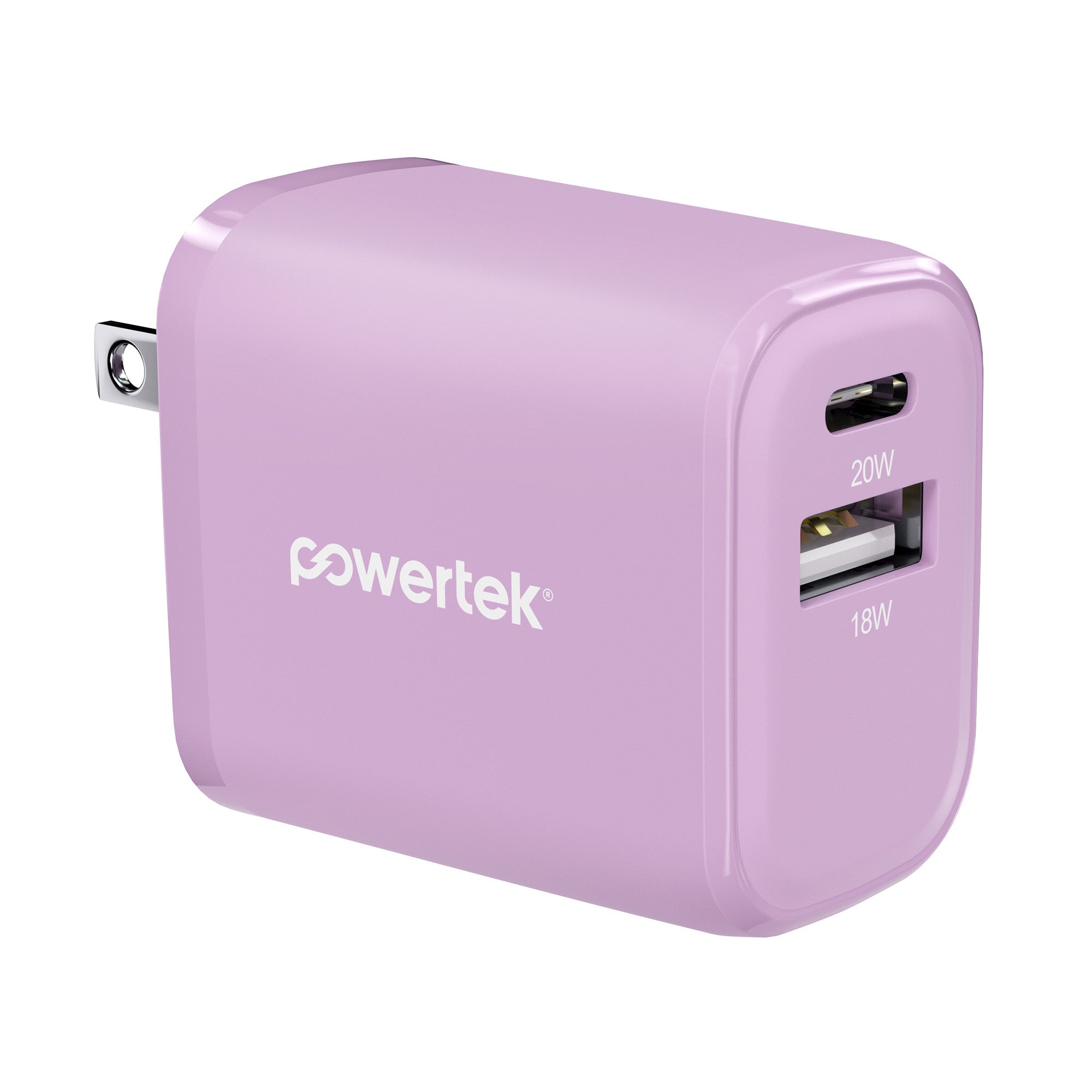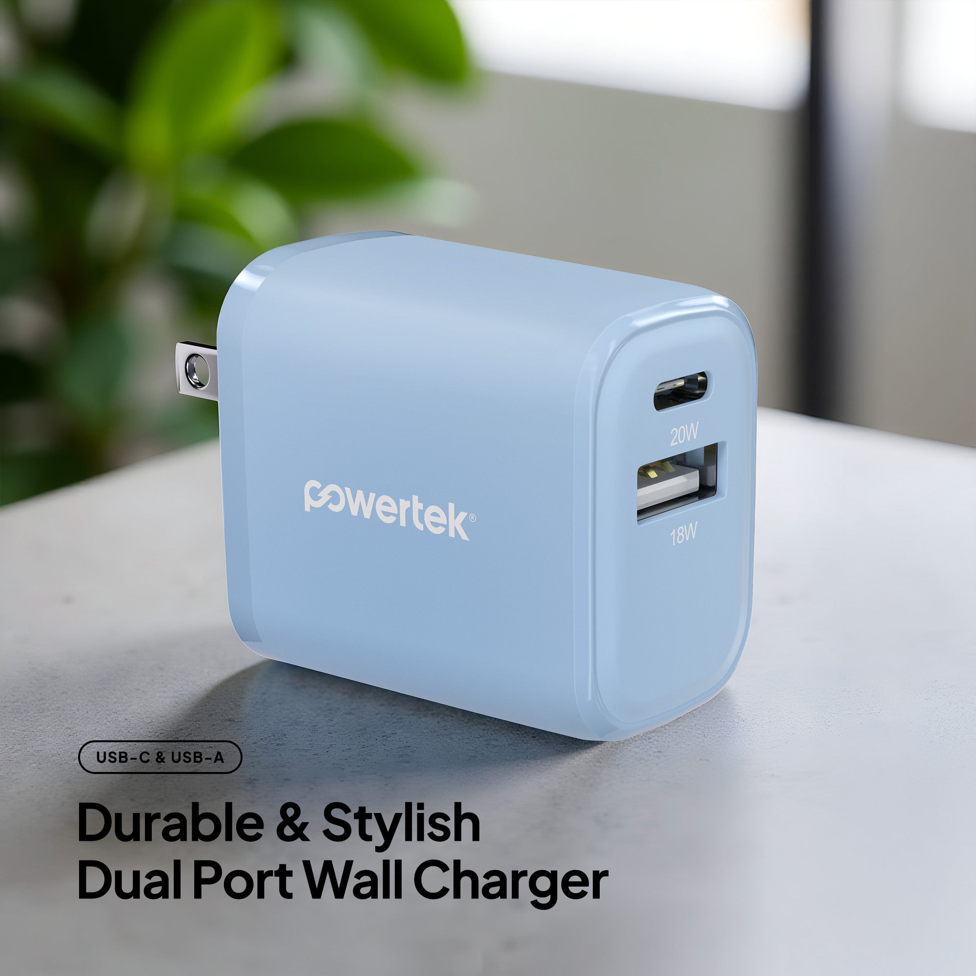 Charge smarter and faster with the Powertek Pastel Braided Wall Block Charger. Featuring a 20W USB-C PD (Power Delivery) port and an additional 18W USB-A port, this compact charger powers your iPhone, Galaxy, Pixel, or other devices up to 50% in just 30 minutes. Lightweight and portable, it’s perfect for home, office, or travel. Universally compatible with smartphones, tablets, and more.