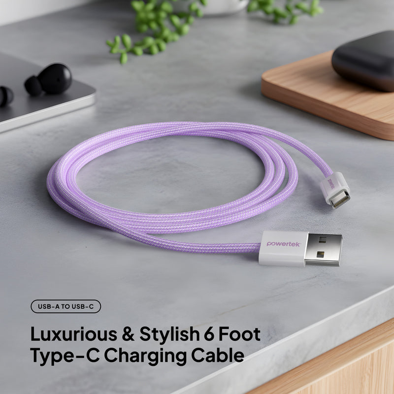Upgrade your everyday charging experience with the Powertek Pastel Braided USB-A to USB-C cable. Built for long-lasting performance, this premium 6-foot cable features a luxurious velvet design and high-quality USB-C chips for reliable, fast charging every time. Available in six stylish colors, so you can pick the perfect match for your phone case or personal style.