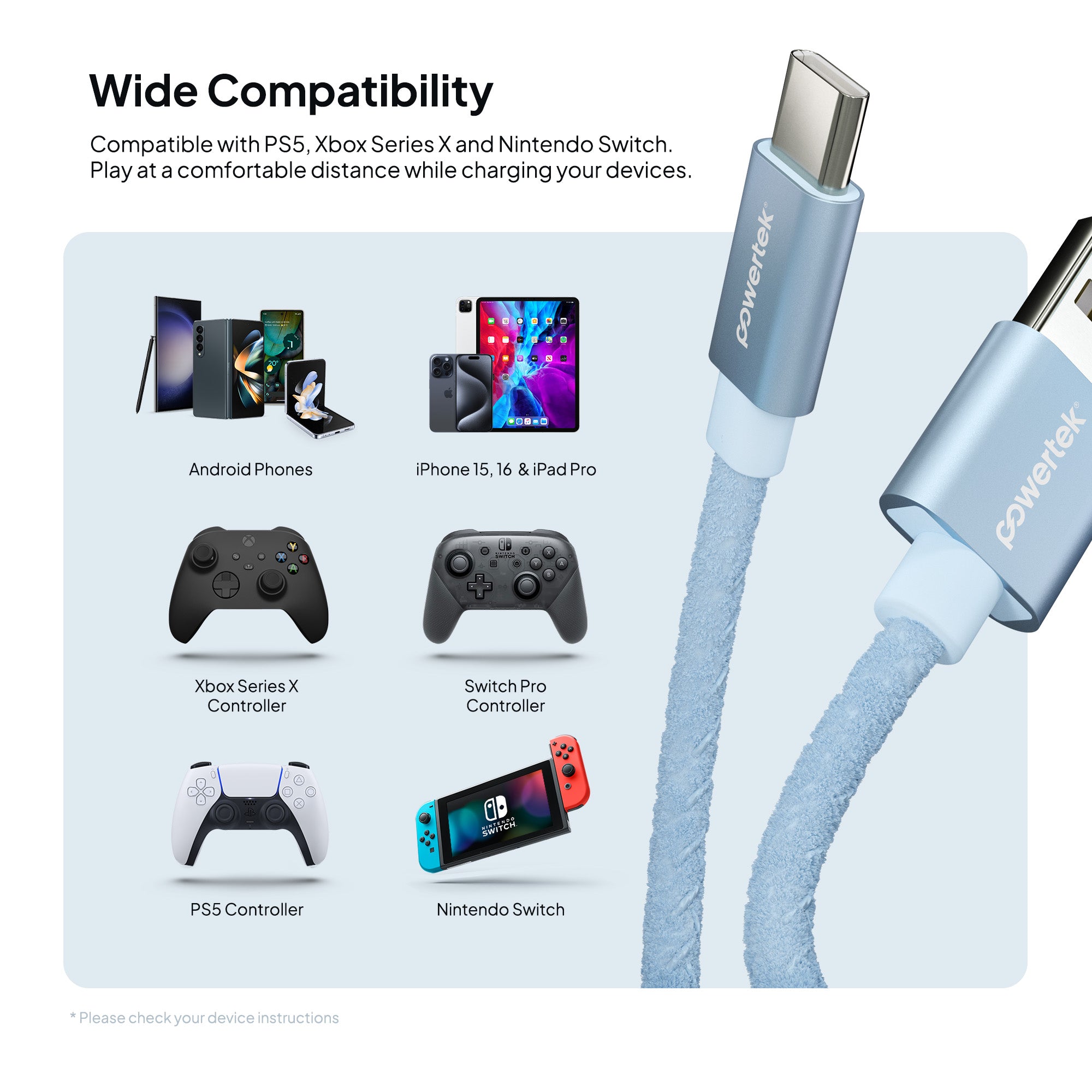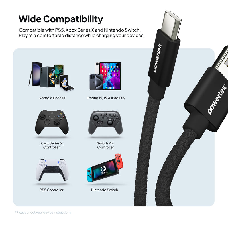 Compatible with smartphones, tablets, and laptops, this cable pairs seamlessly with the Powertek portable battery banks or wall block chargers for the ultimate charging setup.