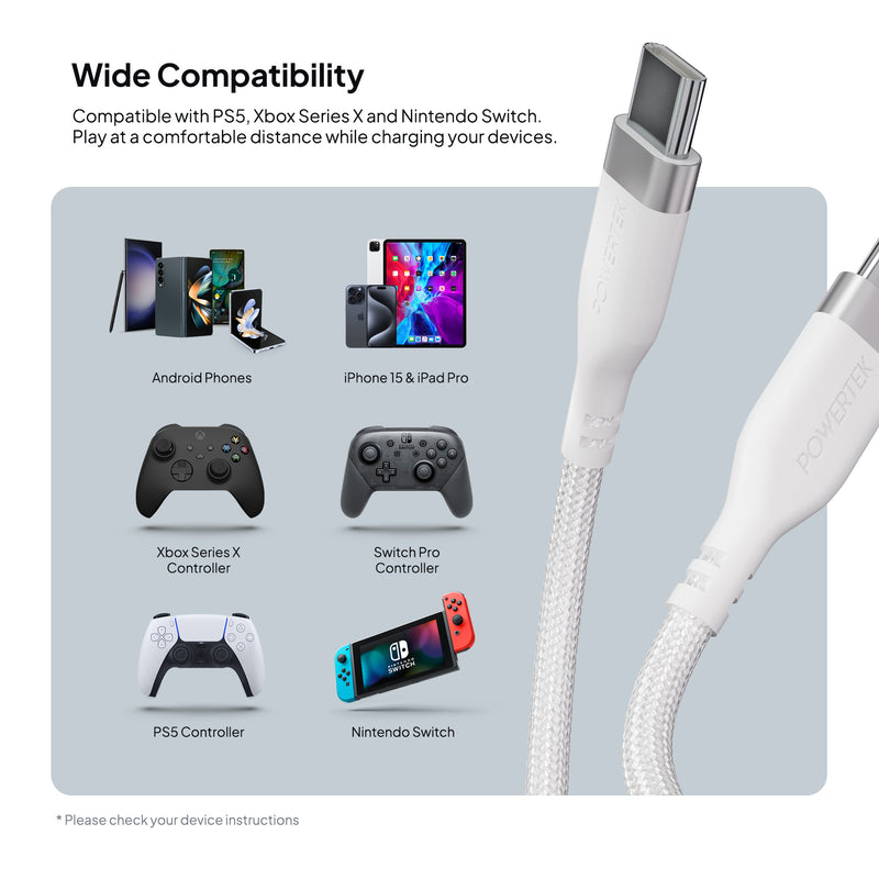 Compatible with smartphones, tablets, and laptops, this cable pairs seamlessly with the Powertek portable battery banks or wall block chargers for the ultimate charging setup.