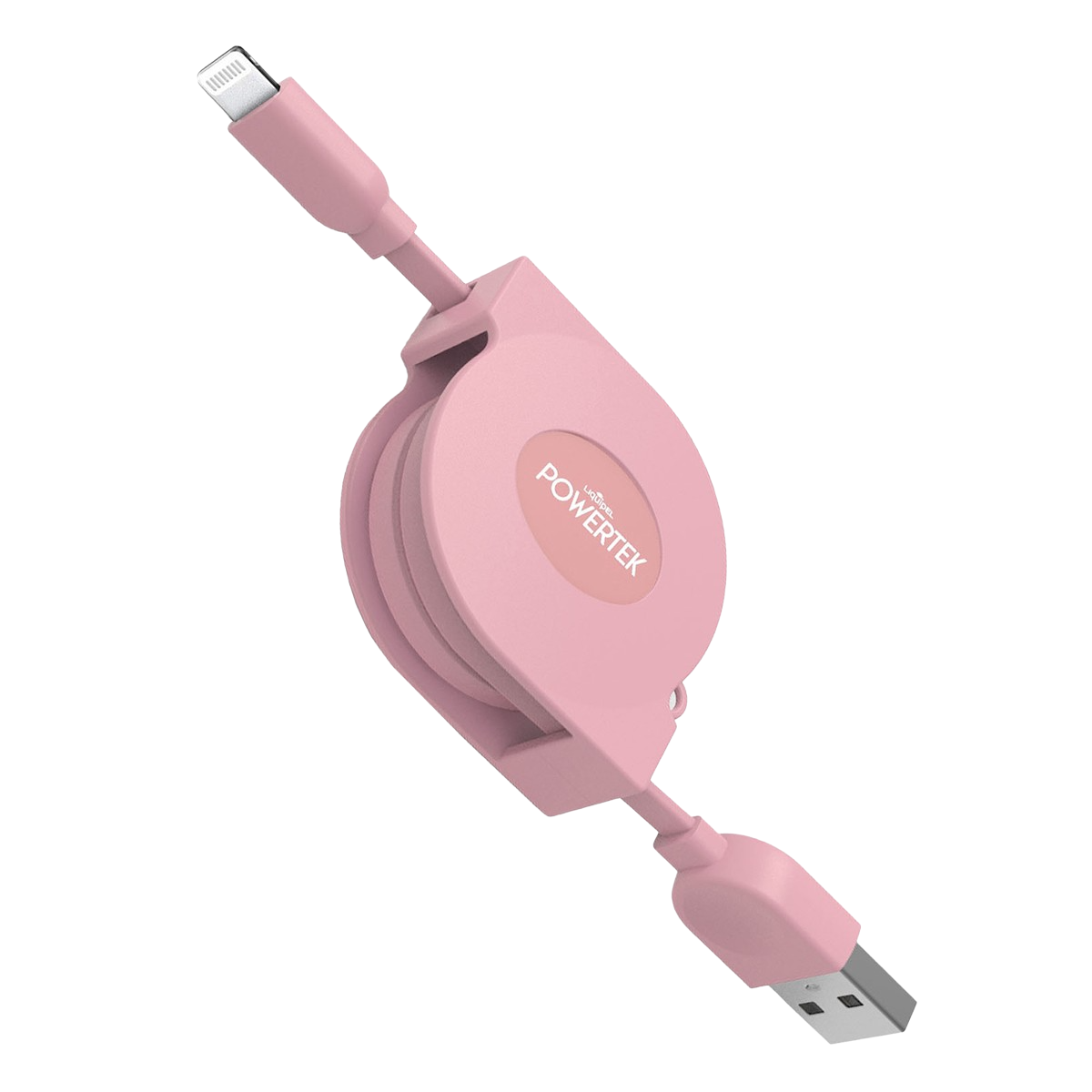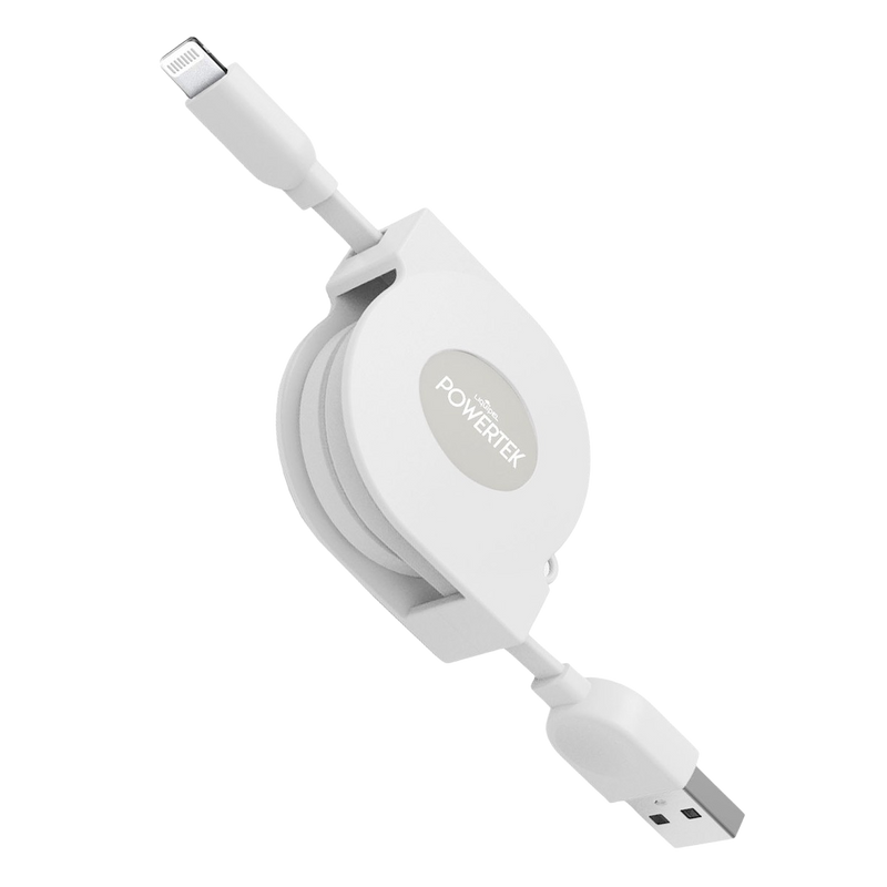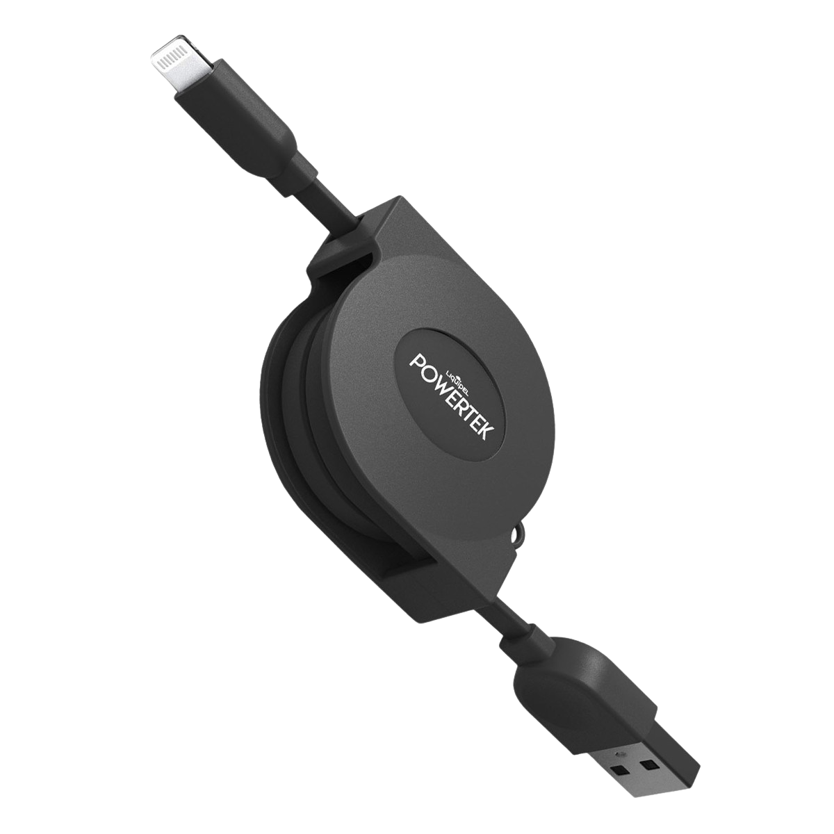 The Powertek Retractable 3ft charging cable offers efficient fast charging in a sleek, compact design, ideal for life on the go. Its reinforced aluminum spool ensures smooth, tangle-free retraction every time, making it both durable and easy to use. For fast charging, ensure you are using a power source of at least 2.1 amps.